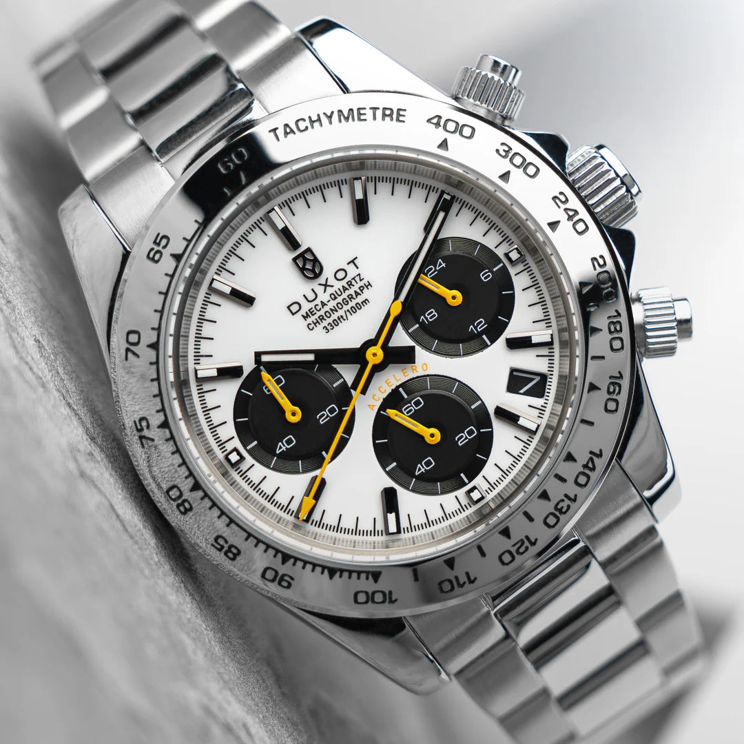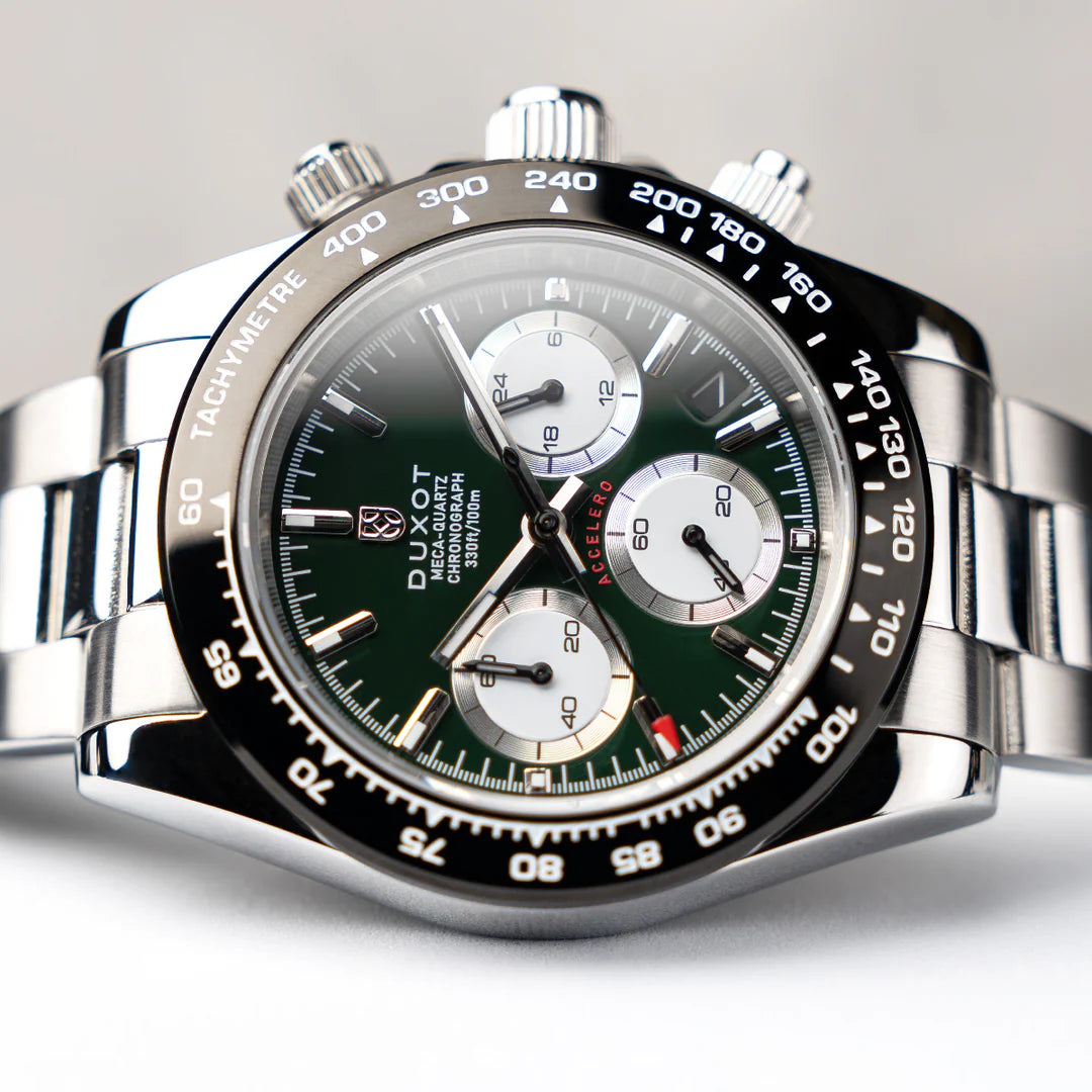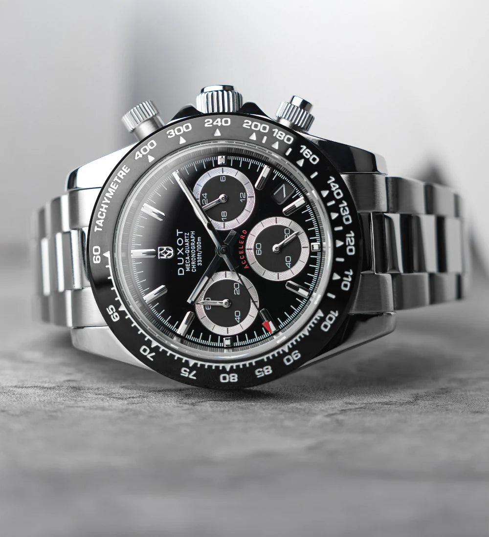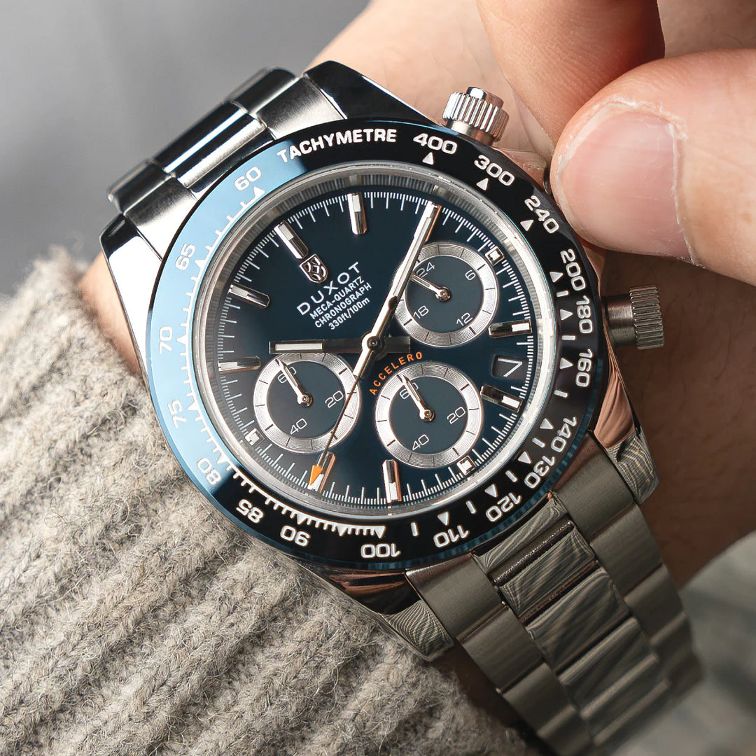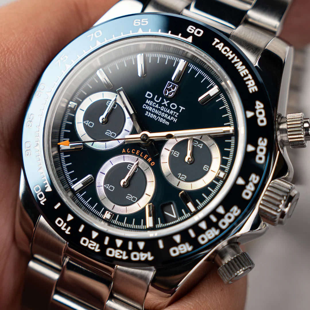 Descubra o equilíbrio perfeito entre maestria técnica e estilo atemporal. Movido por um movimento cronógrafo quartzo japonês e envolto em uma robusta caixa de aço inoxidável de 40mm, o Accelero é o acessório essencial para o seu pulso.