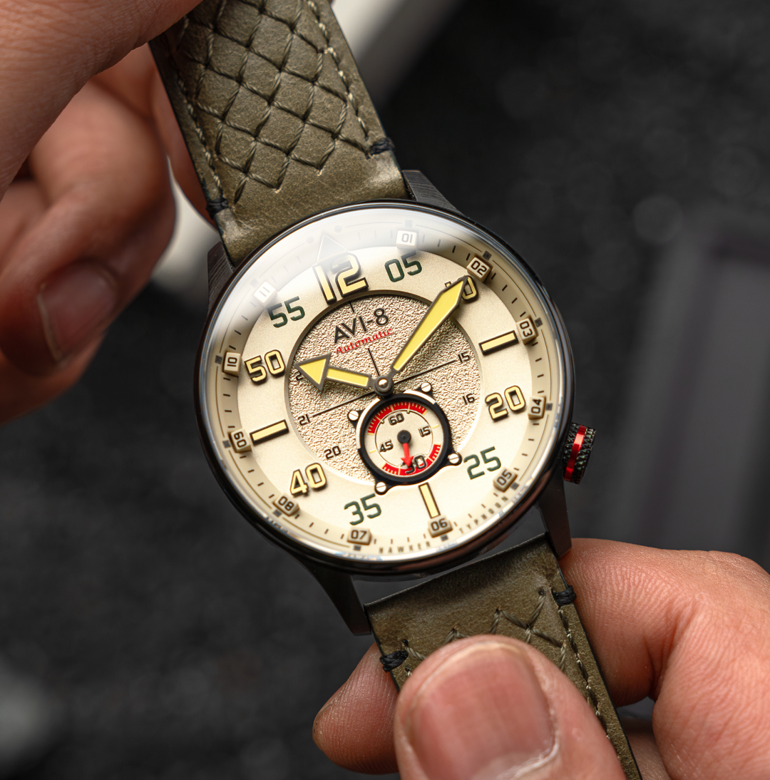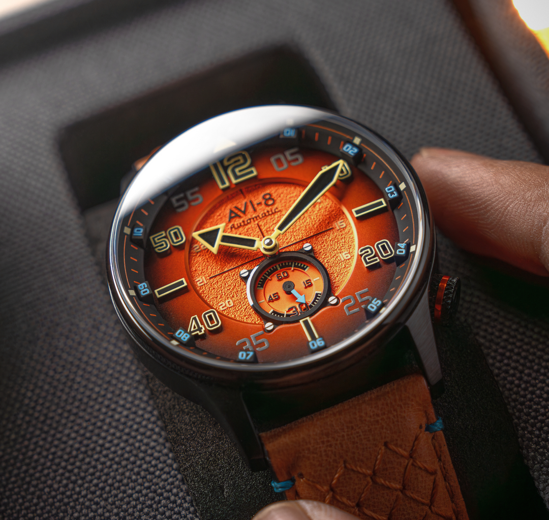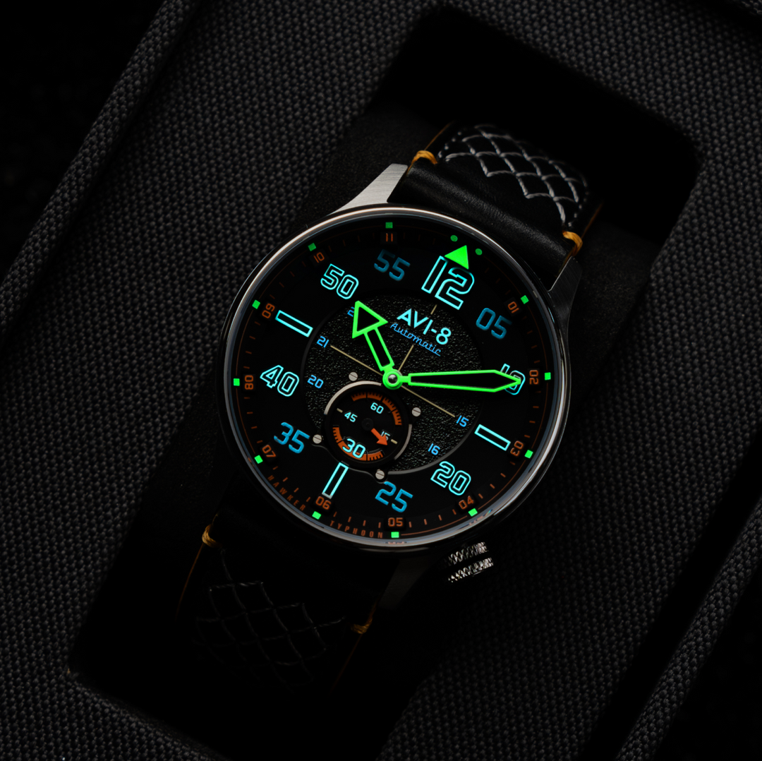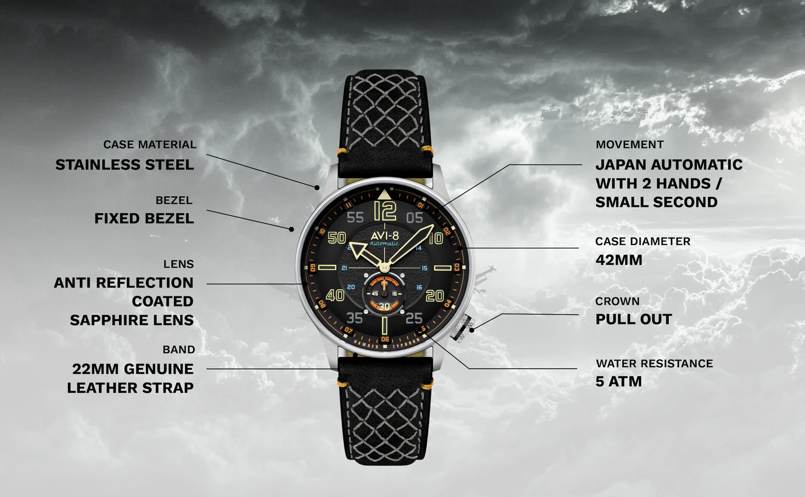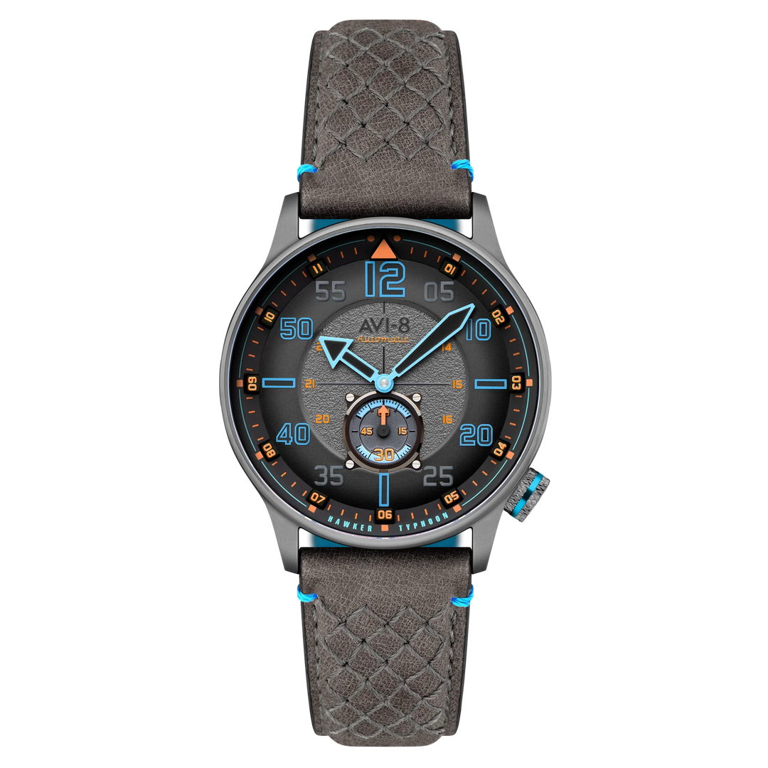 O Hawker Typhoon Baldwin Automatic homenageia seu homônimo com ponteiros e um mostrador inspirado no painel de instrumentos da aeronave icônica. O padrão de costura de couro na pulseira reflete o design do assento do Hawker Typhoon, realçando seu apelo autêntico.