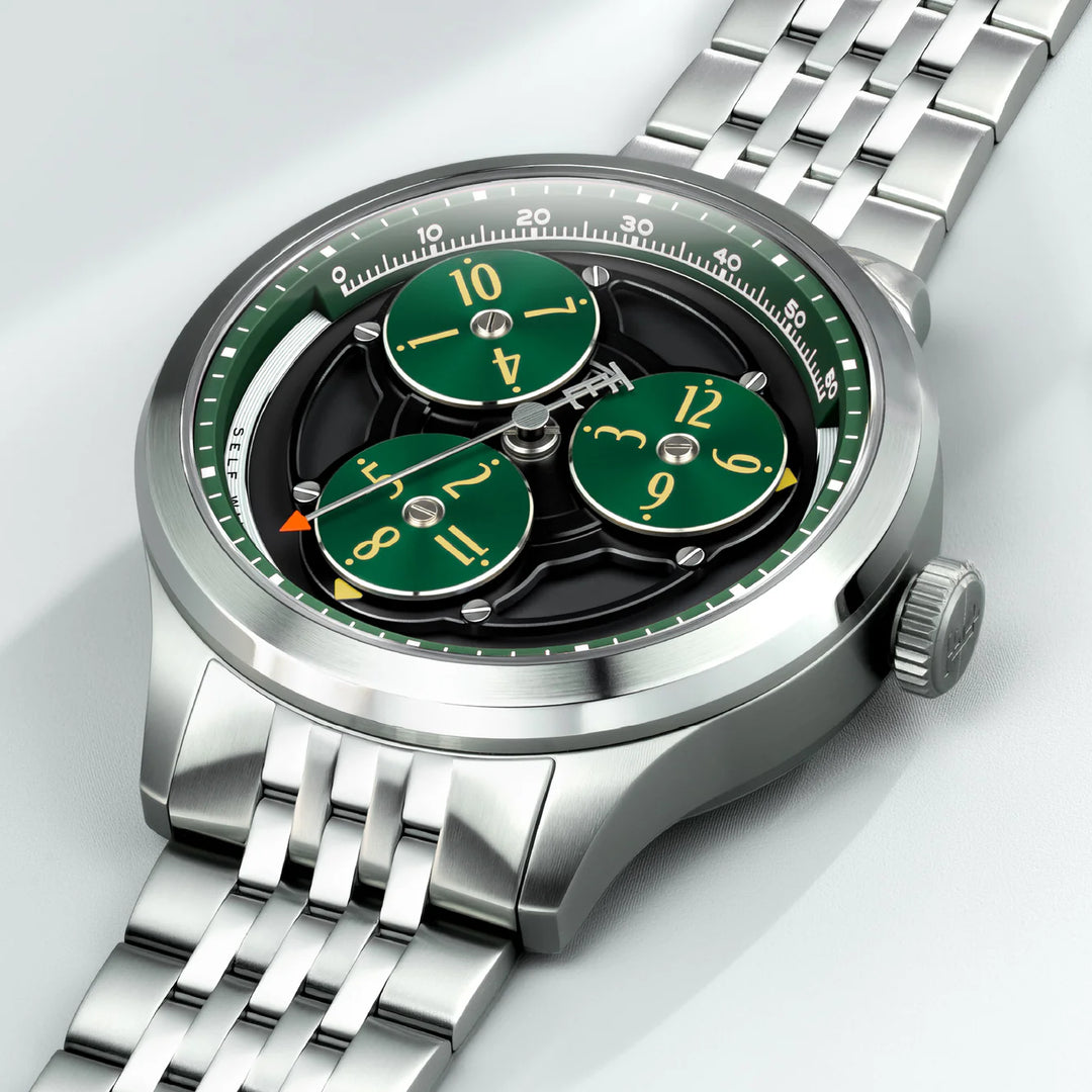O Hexham Trisect Automatic é mais do que um relógio — é uma ousada interpretação do próprio tempo. Três discos rotativos oferecem uma visão dinâmica e multidimensional de cada hora, emoldurados por uma caixa de aço inoxidável de 43mm, com vidro de safira e fundo transparente.