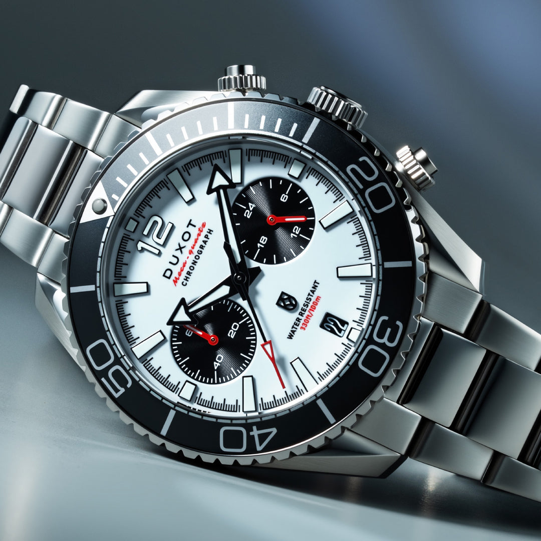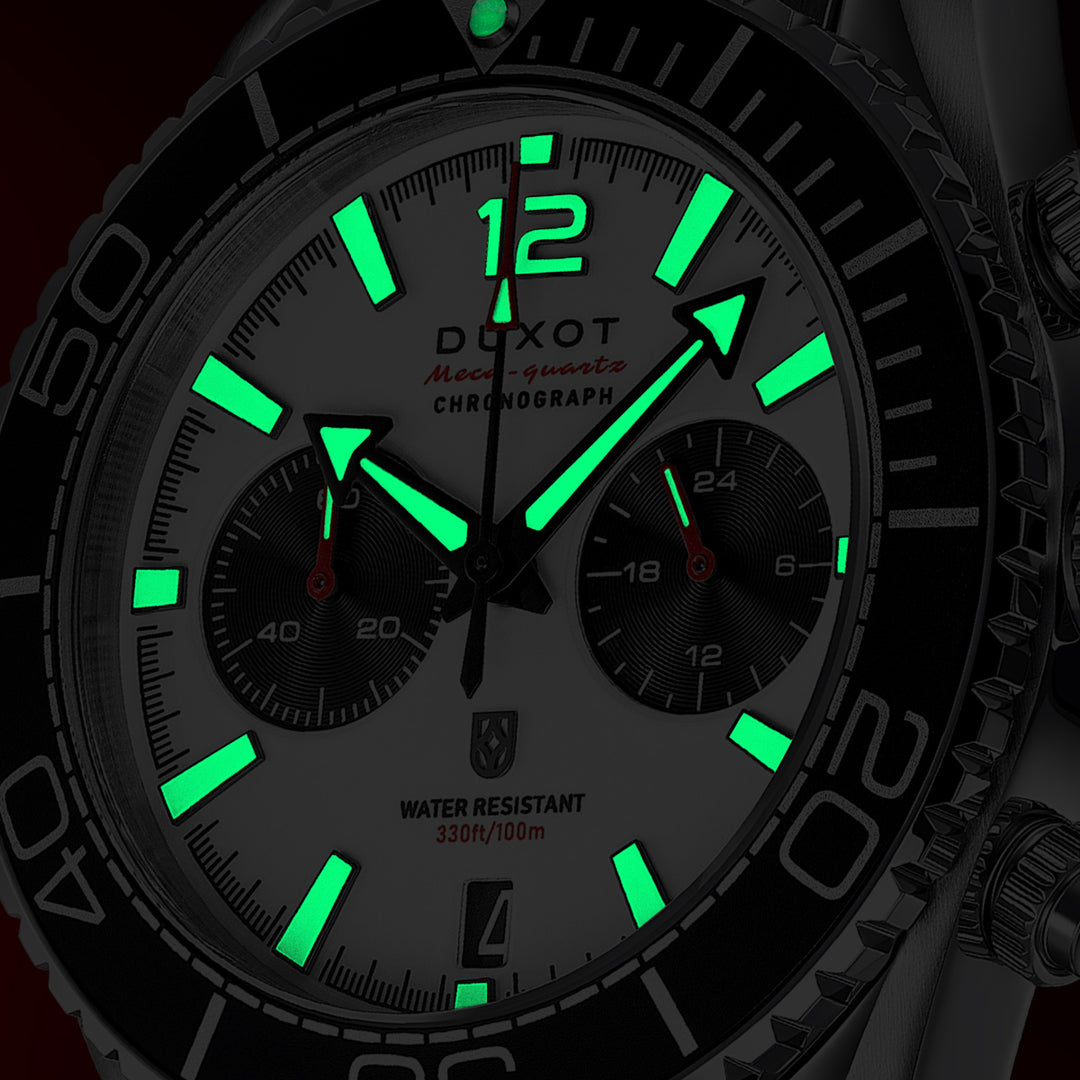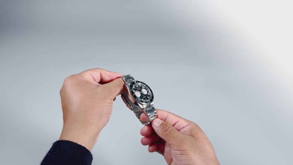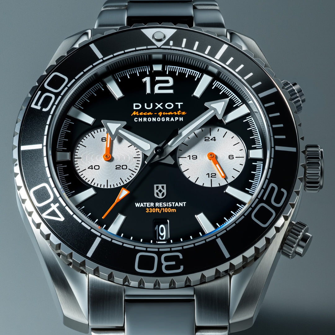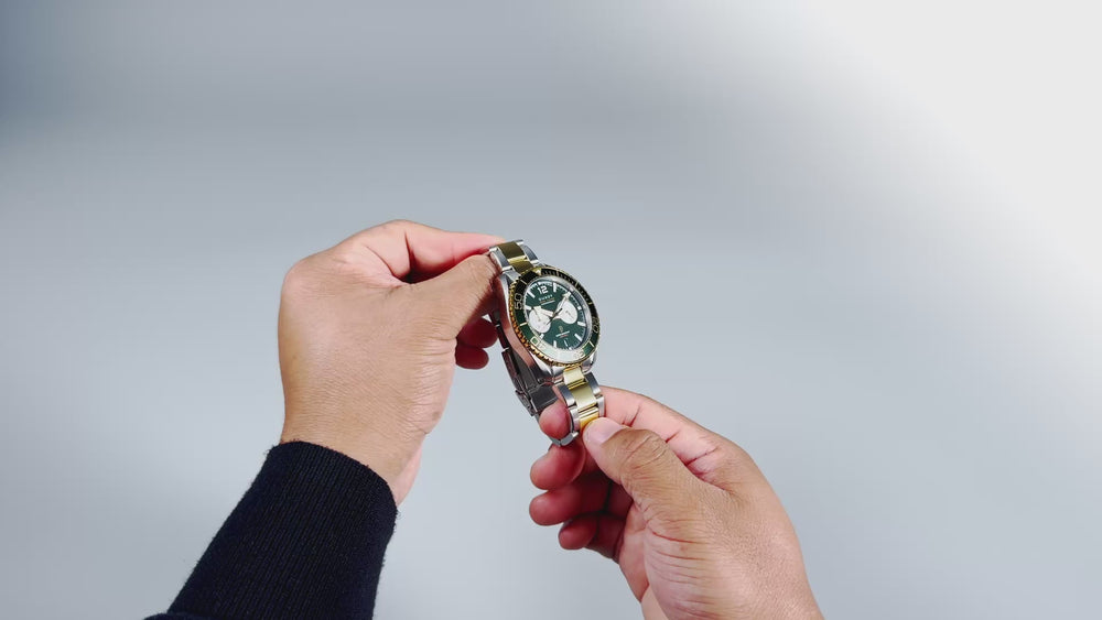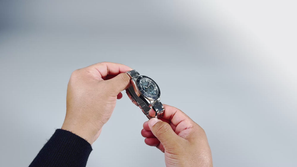 Mergulhe nas profundezas com o Cronógrafo Tiburon. Com resistência à água de 10 ATM, bisel unidirecional e ponteiros inspirados na cauda do tubarão, este relógio chama a atenção em terra e no fundo do mar.