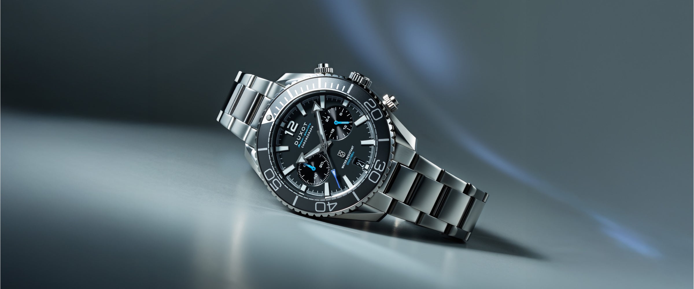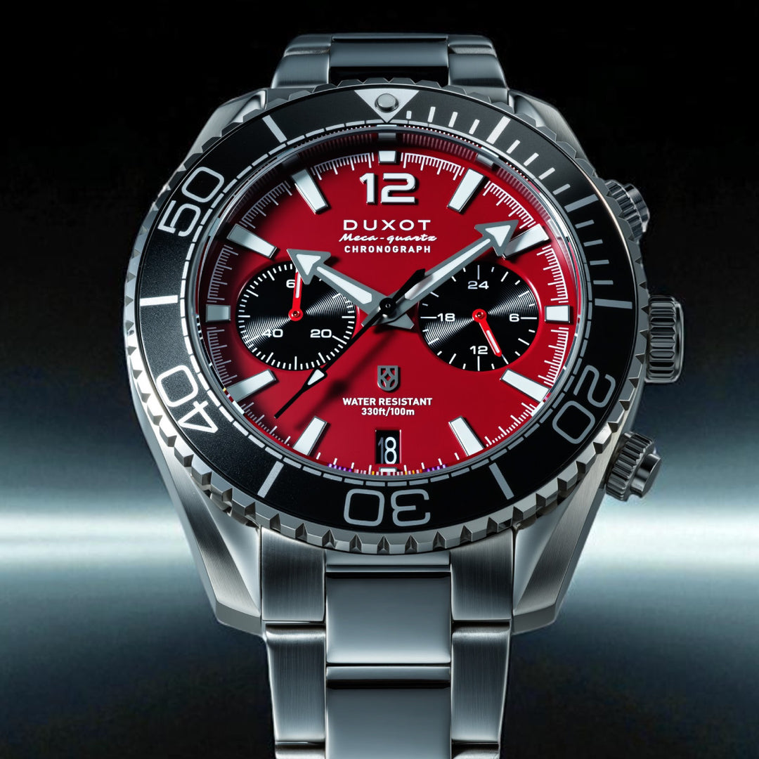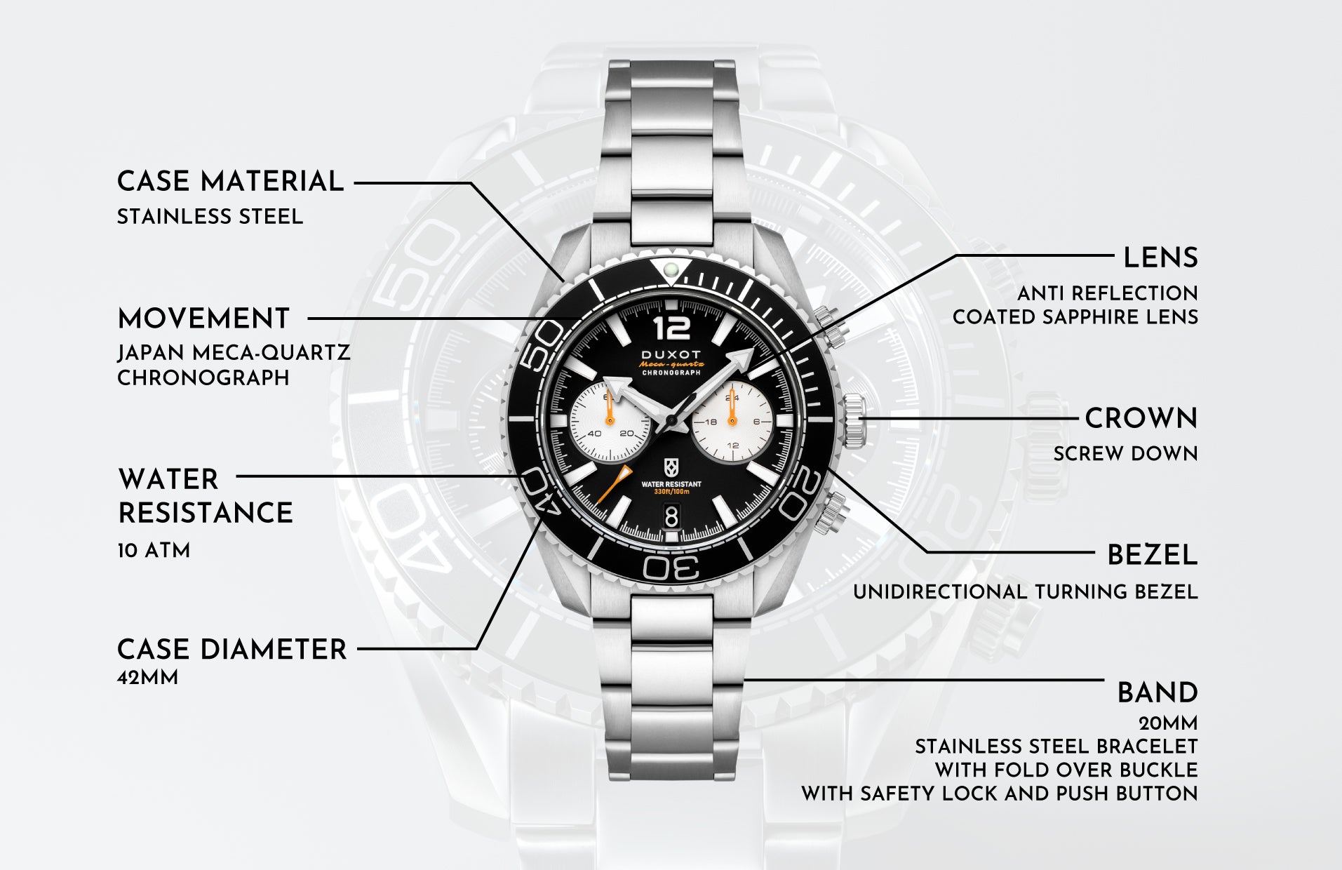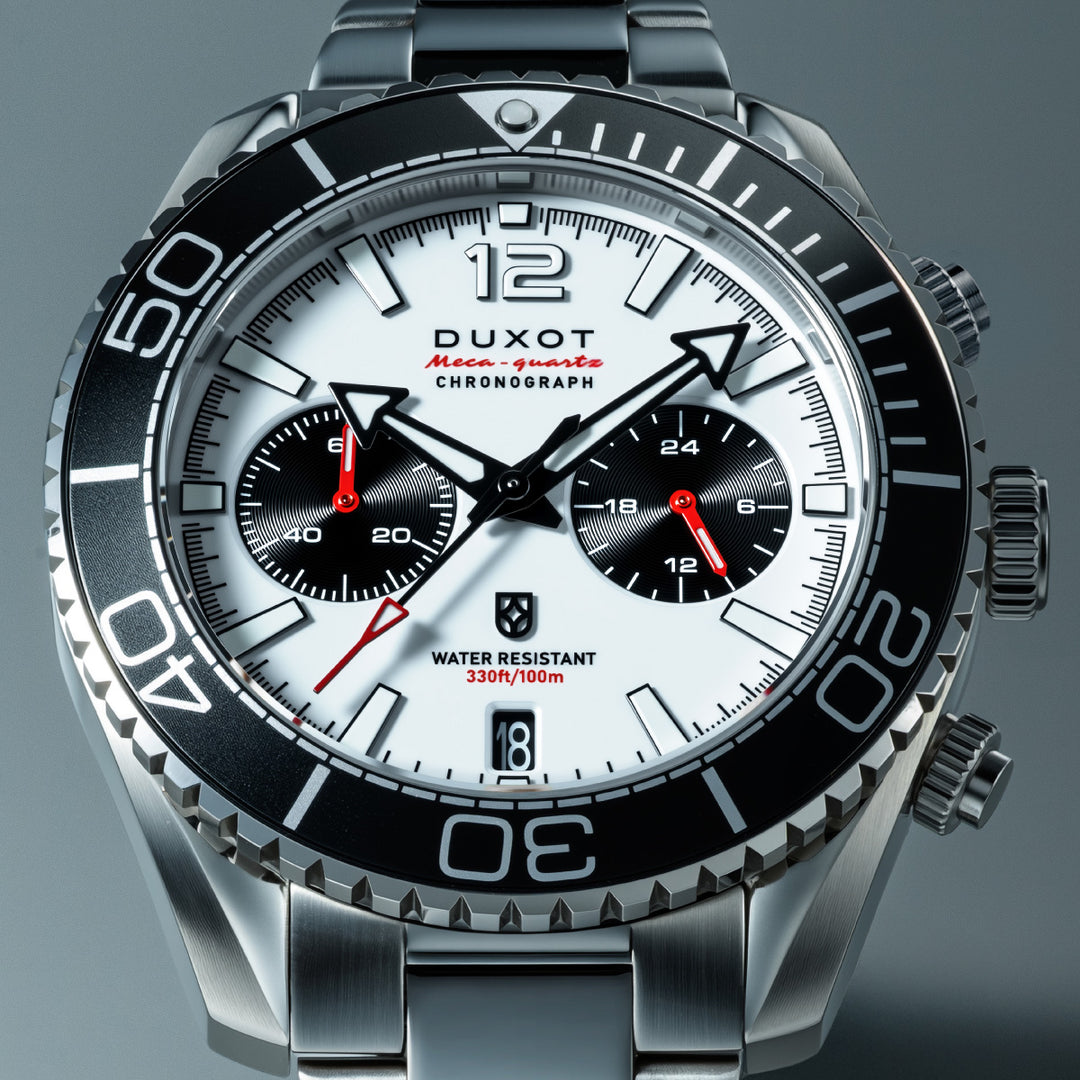 Mergulhe nas profundezas com o Cronógrafo Tiburon. Com resistência à água de 10 ATM, bisel unidirecional e ponteiros inspirados na cauda do tubarão, este relógio chama a atenção em terra e no fundo do mar.
