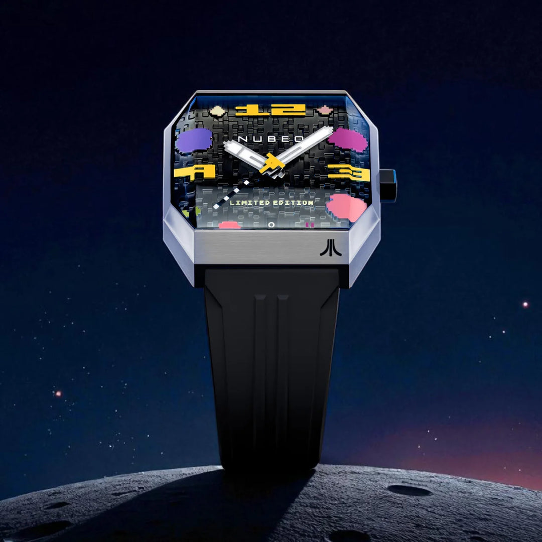 Criado no formato do console ATARI 2600 original, este relógio de caixa quadrada captura a essência dos jogos clássicos. Com um movimento automático japonês de 3 ponteiros e um ponteiro de segundos em forma de nave espacial, é uma máquina do tempo para o seu pulso.