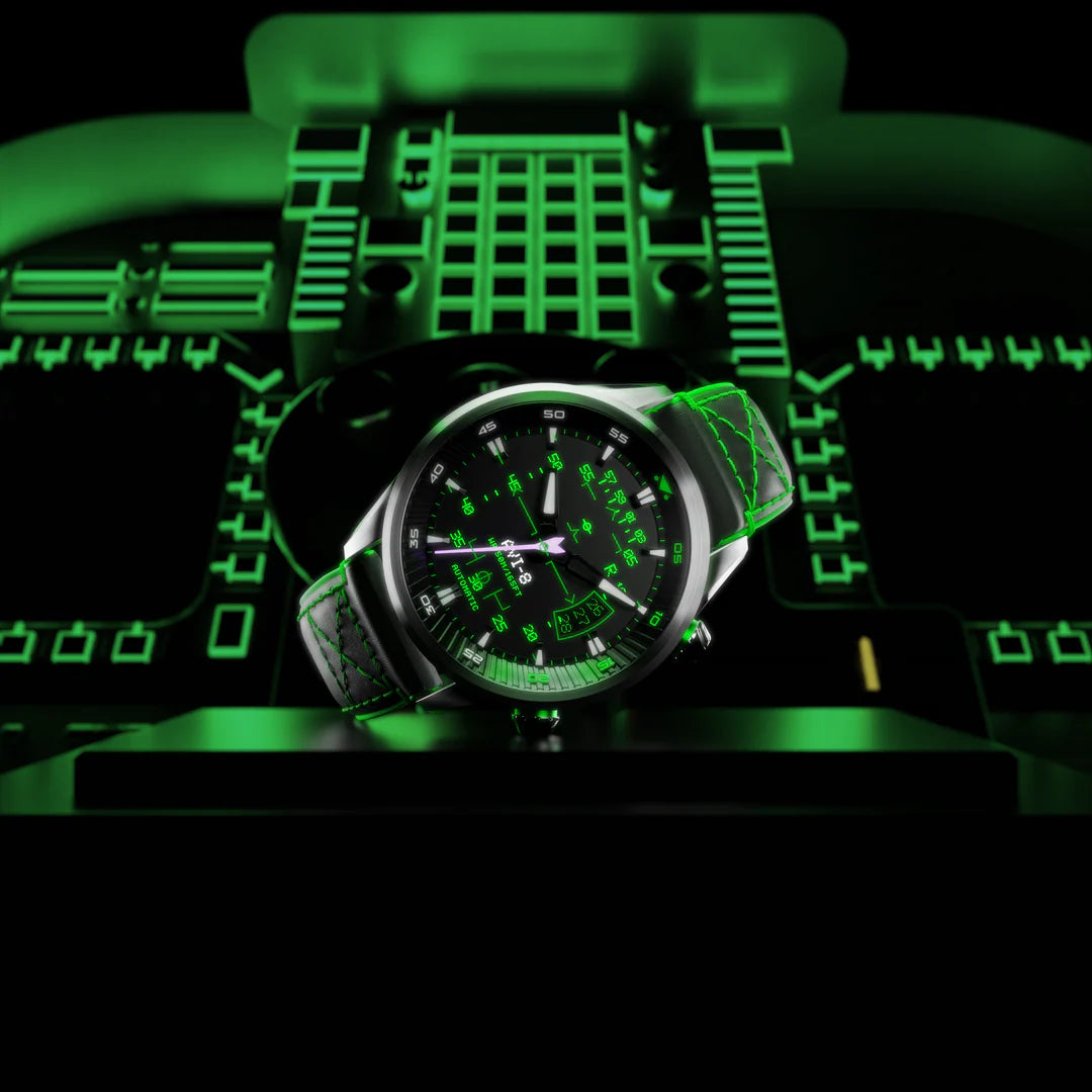 Experimente nosso design exclusivo de mostrador com efeito degradê, que transita sem esforço de tons vibrantes para nuances profundas. A construção multicamadas imita os instrumentos de aeronaves, enquanto a impressão luminescente garante clareza.