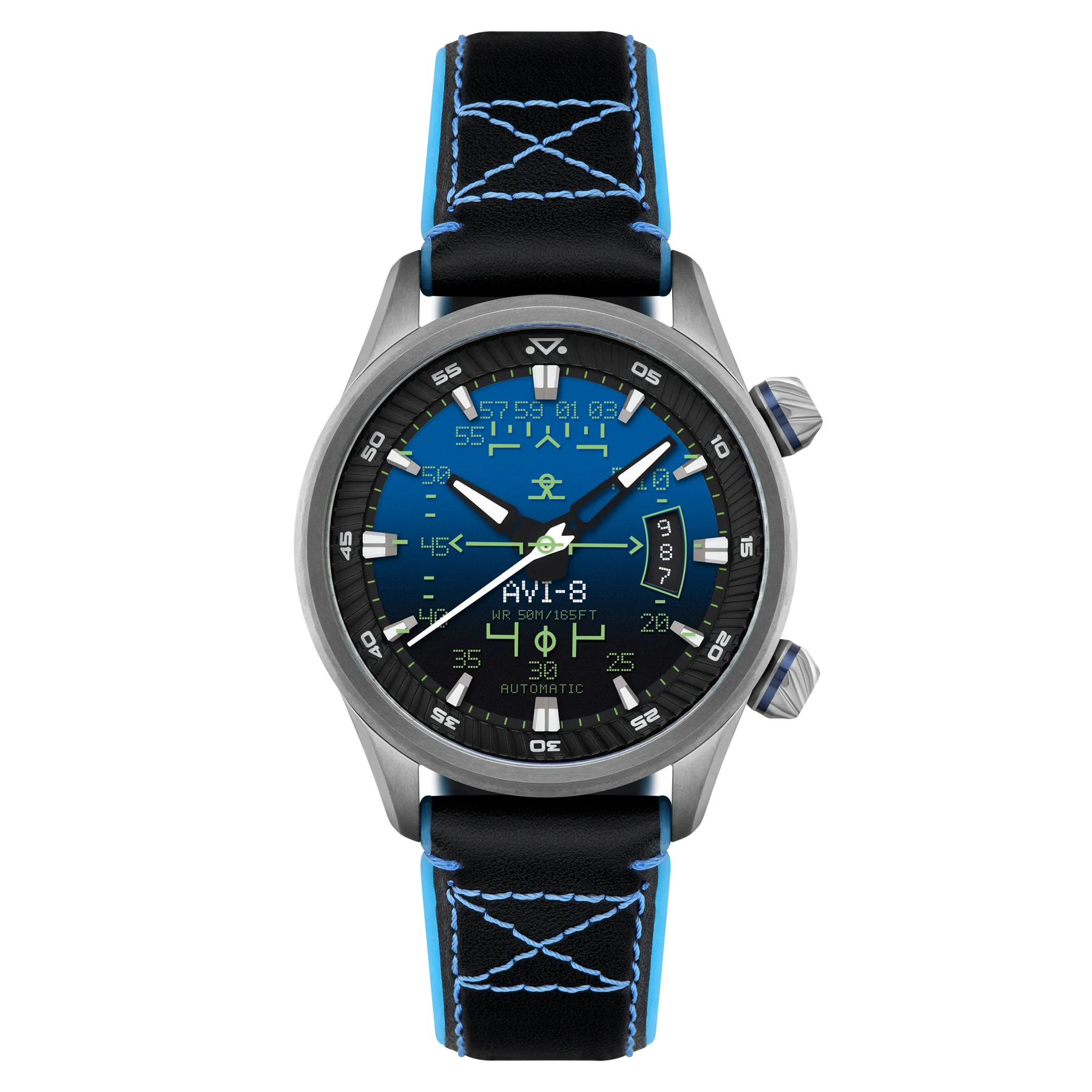 Experimente nosso design exclusivo de mostrador com efeito degradê, que transita sem esforço de tons vibrantes para nuances profundas. A construção multicamadas imita os instrumentos de aeronaves, enquanto a impressão luminescente garante clareza.