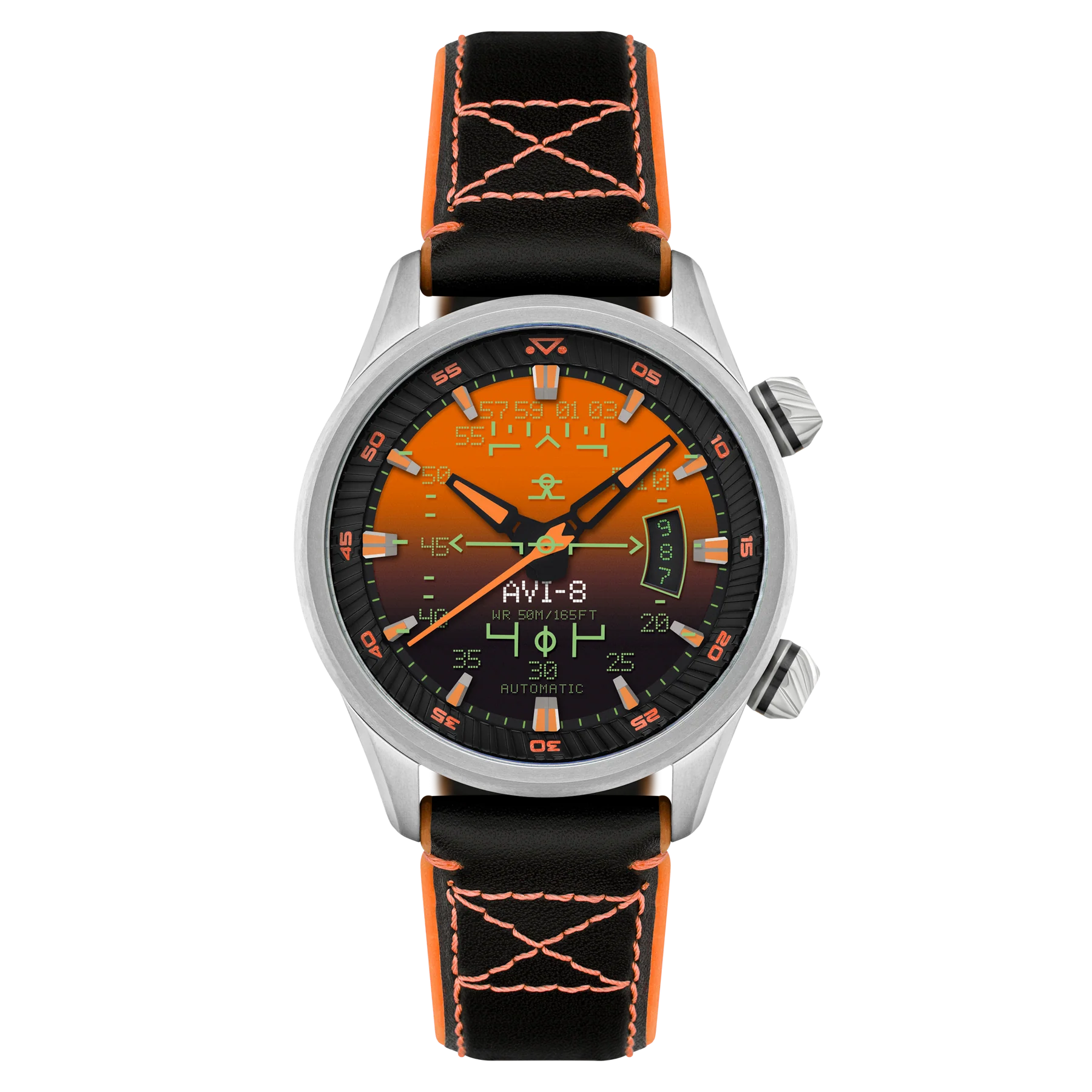 Experimente nosso design exclusivo de mostrador com efeito degradê, que transita sem esforço de tons vibrantes para nuances profundas. A construção multicamadas imita os instrumentos de aeronaves, enquanto a impressão luminescente garante clareza.