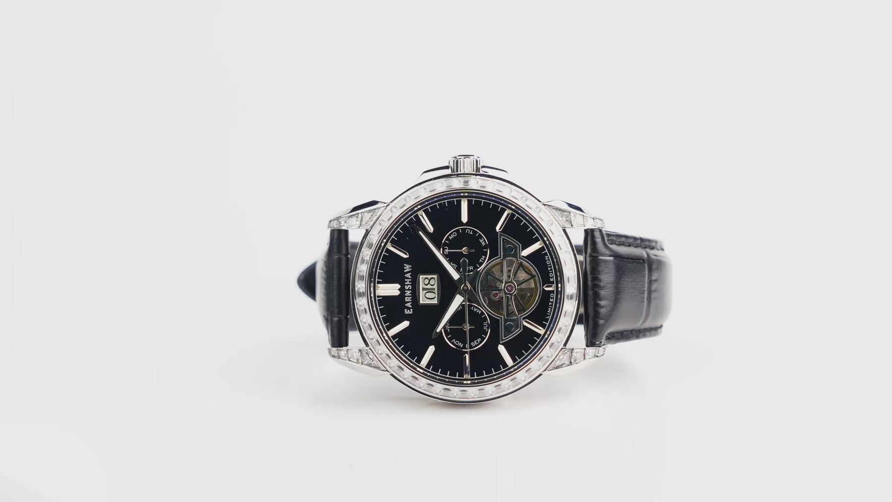 Mostrador com abertura central. Fundo da caixa transparente. Pedras cravejadas na luneta. Pulseira em couro genuíno. Uma rara peça de arte relojoeira, pronta para adornar seu pulso.
