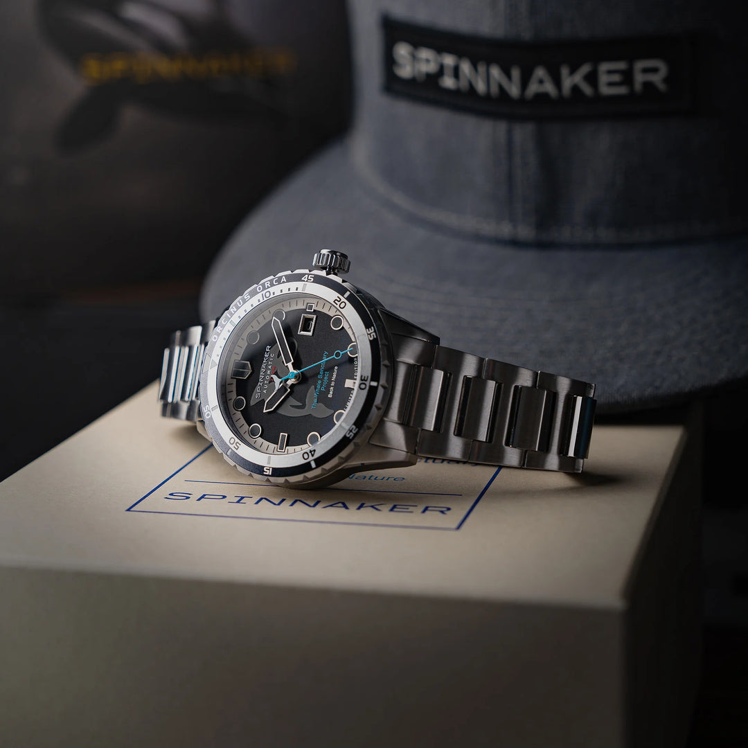 Esta coleção possui uma caixa de aço inoxidável de 43 mm, movimento Japan Automatic e uma pulseira de aço inoxidável. Incorporando elegância e durabilidade atemporais, estes relógios são acompanhados por uma tampa rPET, demonstrando o compromisso da Spinnaker com a sustentabilidade através de materiais reciclados.