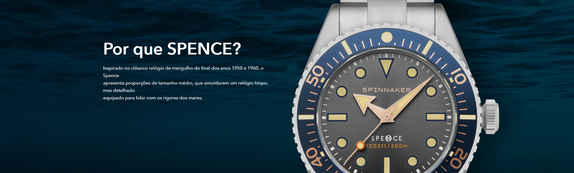 Cuidadosamente finalizado, o case do Spence 300 Automatic levou mais de um ano para ser aperfeiçoado pelos nossos engenheiros. O resultado é um relógio de mergulhador com magreza e discrição quase imperceptíveis que, no entanto, pode comandar mais de 300 m de resistência à água.