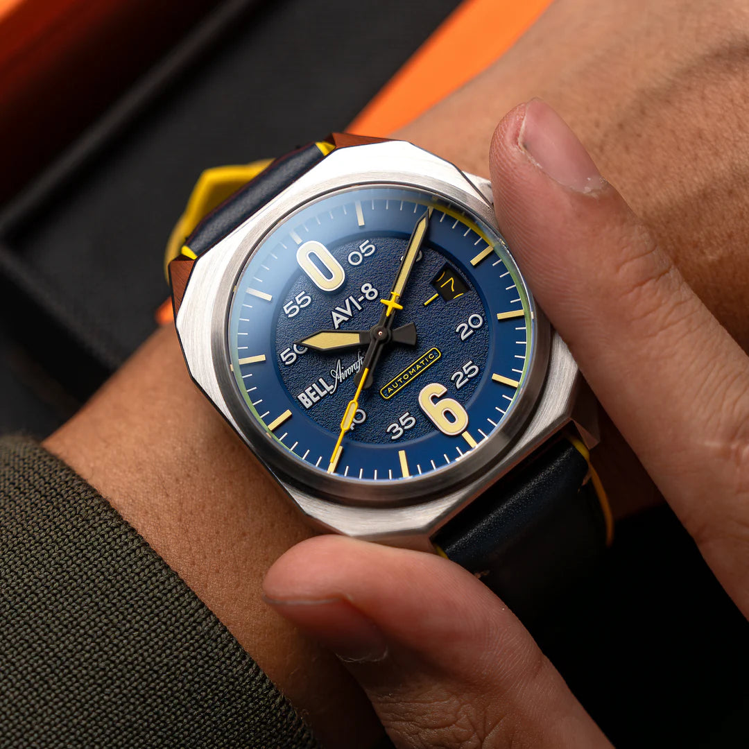 O Bell X-1 Machbuster Automatic apresenta ponteiros e índices luminosos suíços para visibilidade em qualquer condição, um fundo de caixa de exibição transparente com um rotor personalizado inspirado no escapamento do Bell X-1 e uma pulseira híbrida de couro e borracha para durabilidade e conforto. Com um movimento automático japonês e uma lente de safira resistente a arranhões, este relógio oferece precisão e clareza.