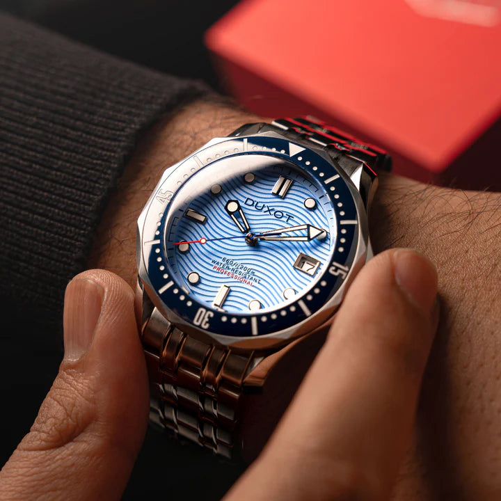 No centro do mostrador, encontra-se um padrão de ondas sutil — uma homenagem ao poder do oceano. Emoldurado por uma luneta unidirecional e com resistência à água de 20 ATM, ele foi projetado tanto para mergulhos profundos quanto para uso diário.