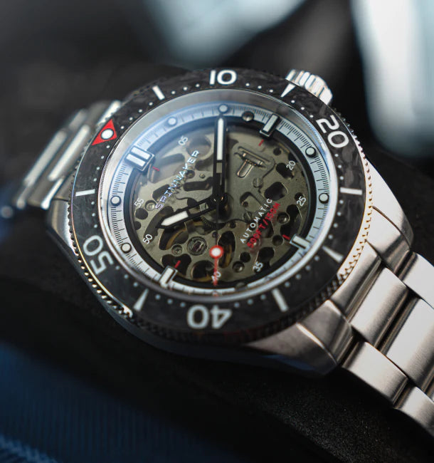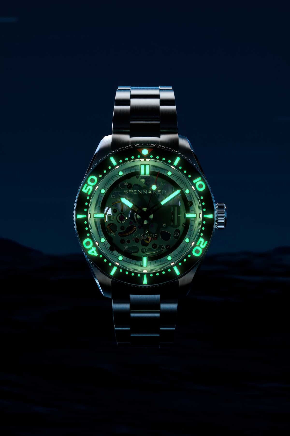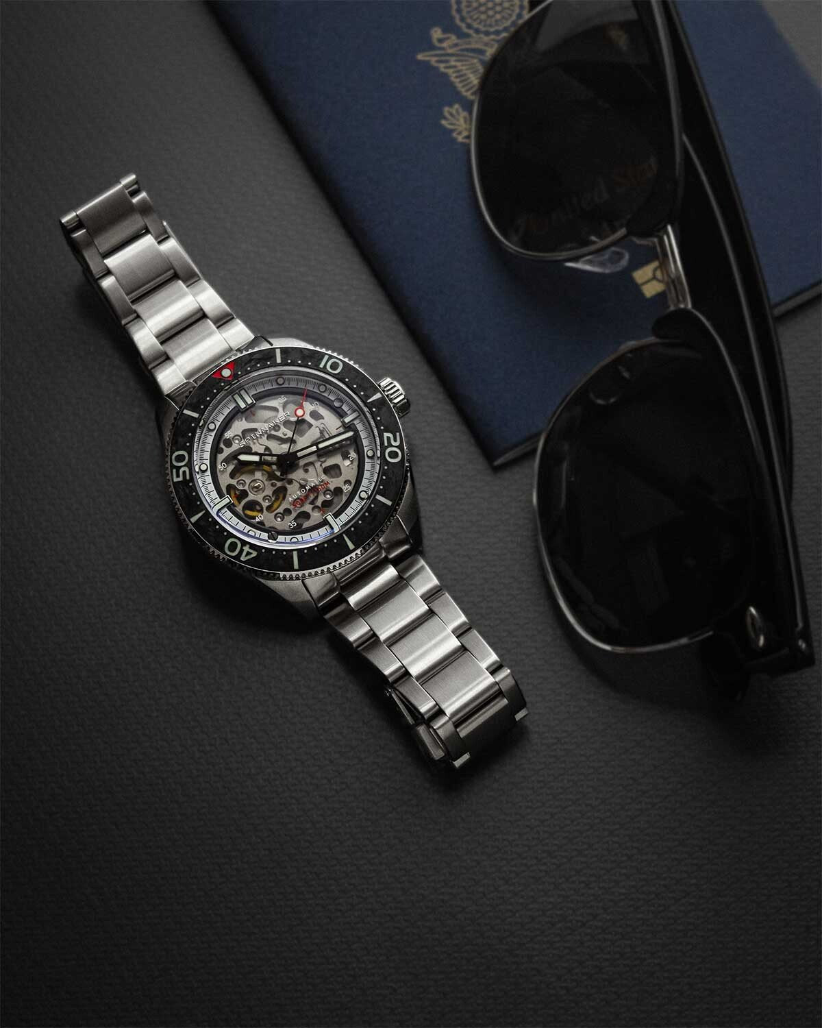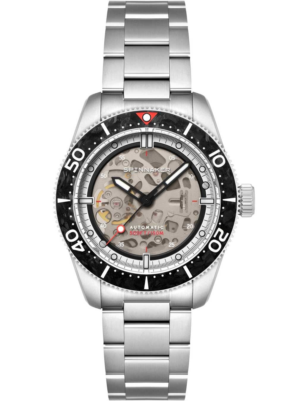 • Uma evolução convincente da icônica coleção Croft da Spinnaker, o Croft 42 Skeleton Automatic oferece três variações distintas de aro – fibra de carbono forjada, aço inoxidável e cerâmica – cada uma conta uma história única de resiliência e estilo. Com o movimento automático esqueletizado NH70 que traz profundidade a cada olhar, é hora, em sua forma mais pura e cativante.