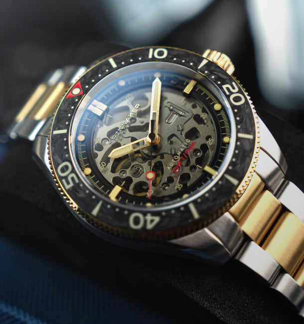 • Uma evolução convincente da icônica coleção Croft da Spinnaker, o Croft 42 Skeleton Automatic oferece três variações distintas de aro – fibra de carbono forjada, aço inoxidável e cerâmica – cada uma conta uma história única de resiliência e estilo. Com o movimento automático esqueletizado NH70 que traz profundidade a cada olhar, é hora, em sua forma mais pura e cativante.