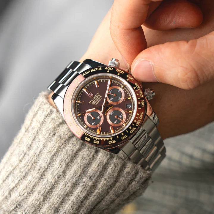 Equipado com um mecanismo de quartzo cronógrafo japonês e alojado numa robusta caixa de aço inoxidável de 40 mm, o Accelero é o acessório essencial para o seu pulso.