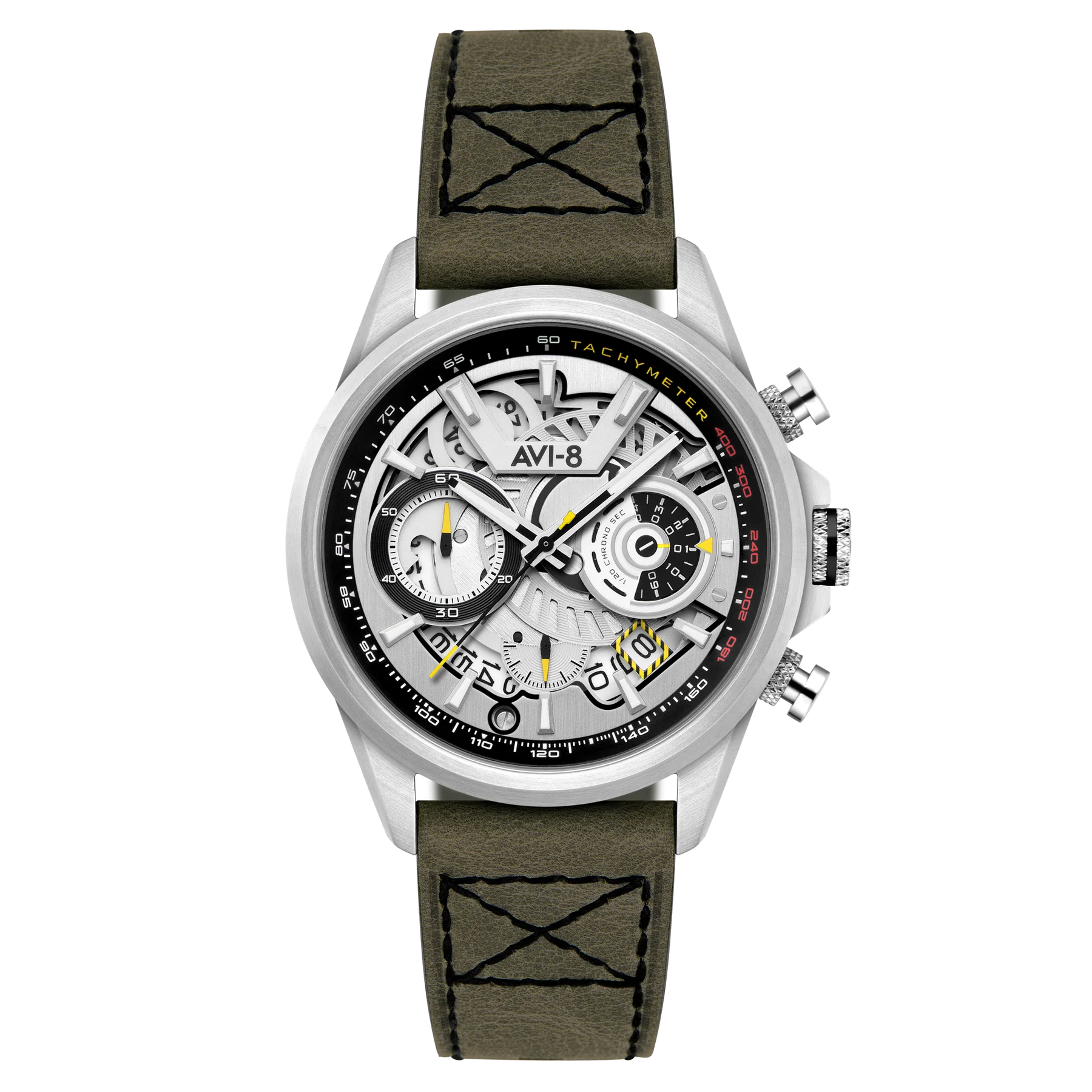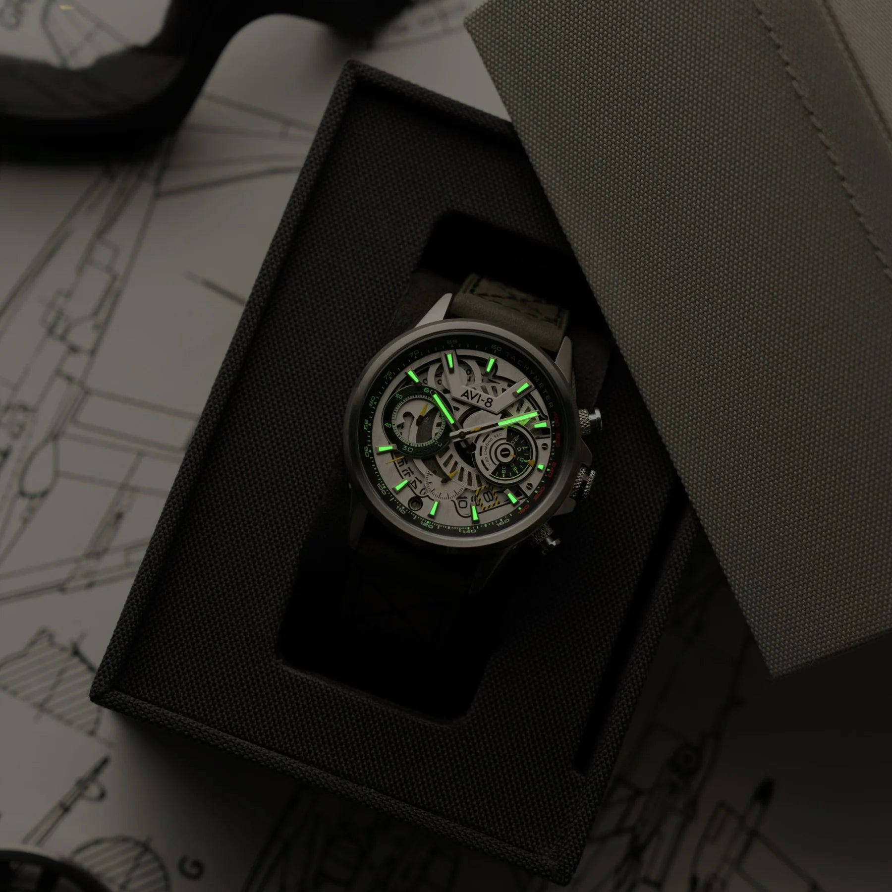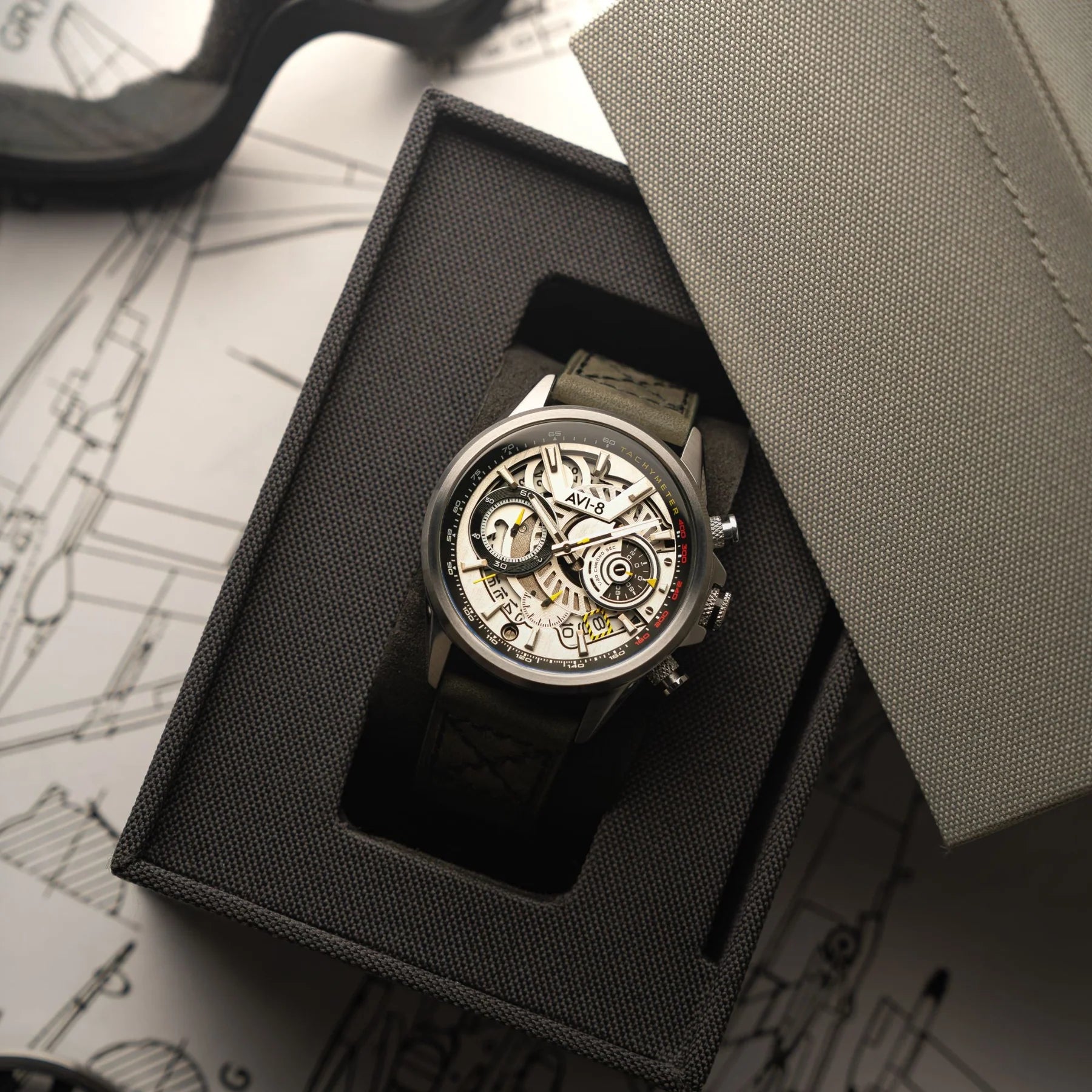 O fundo da caixa do Matador Chronograph evoca a turbina do motor Pegasus, levando o poderoso legado do jato Harrier diretamente para o seu pulso.
