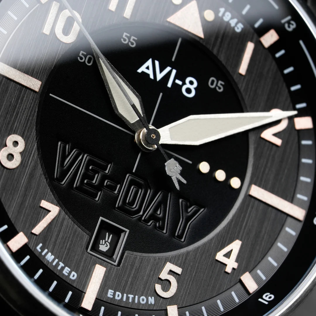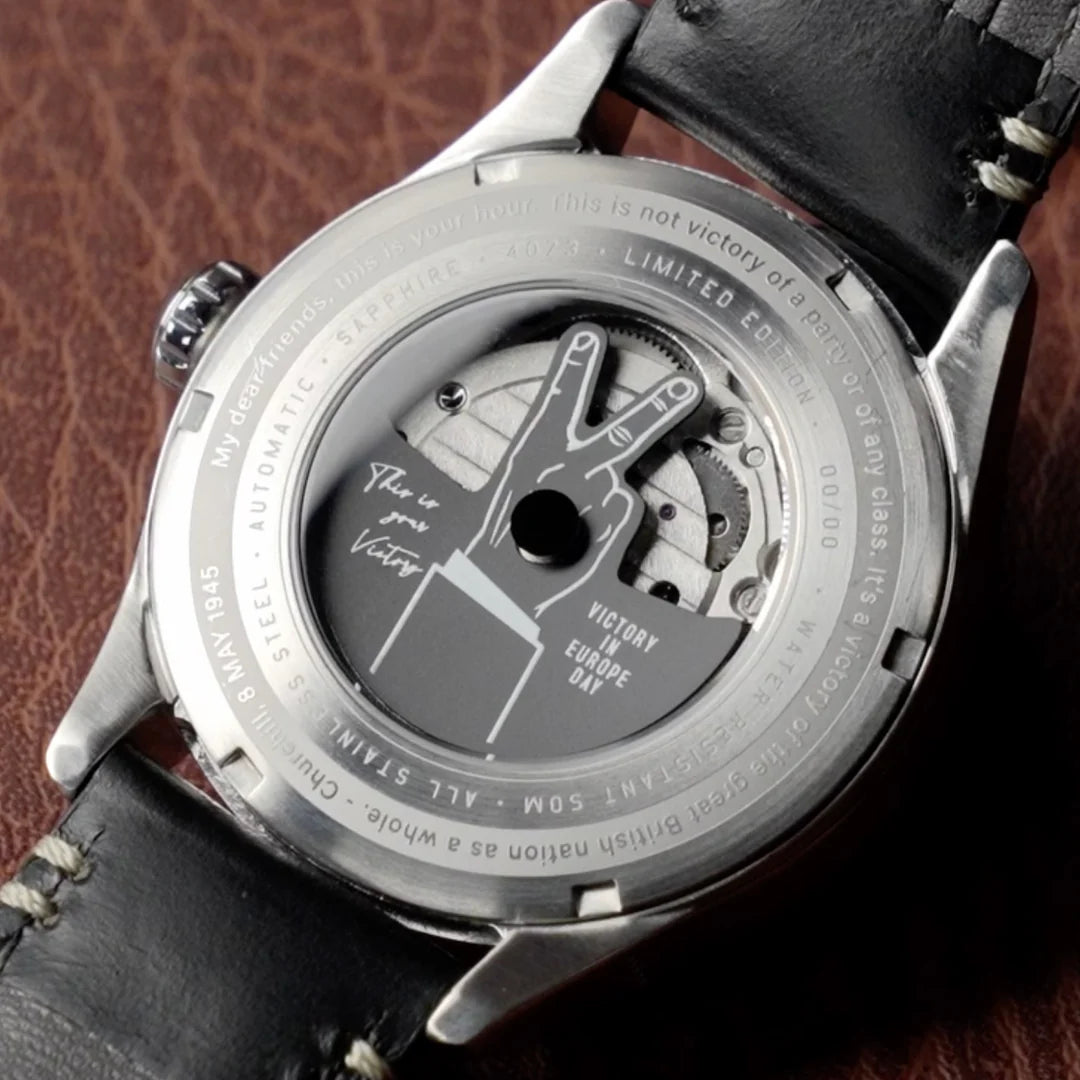 O mostrador conta uma história de triunfo. O disco da data substitui o “8” por um “V” em negrito, em homenagem a 8 de maio de 1945 e à icônica saudação de Churchill. O código Morse para “V” (•••—) está sutilmente gravado, uma mensagem de vitória que outrora ecoou pelos rádios e telegramas.