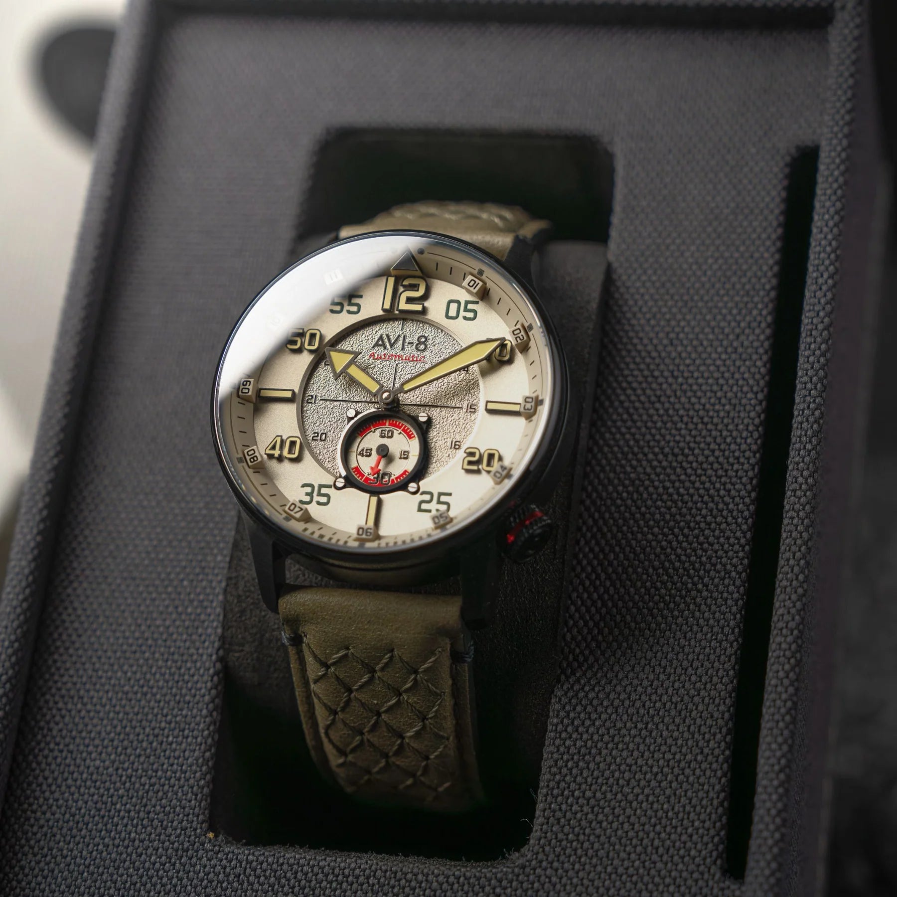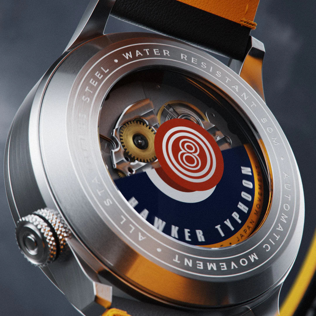 Feito para entusiastas, este relógio apresenta ponteiros suíços luminosos e índices aplicados para clareza em qualquer condição. Sua parte traseira transparente da caixa exibe um rotor personalizado e detalhes inspirados no roundel do Hawker Typhoon. Alimentado por um movimento automático japonês e protegido por uma lente de safira resistente a arranhões, o relógio garante confiabilidade e durabilidade.