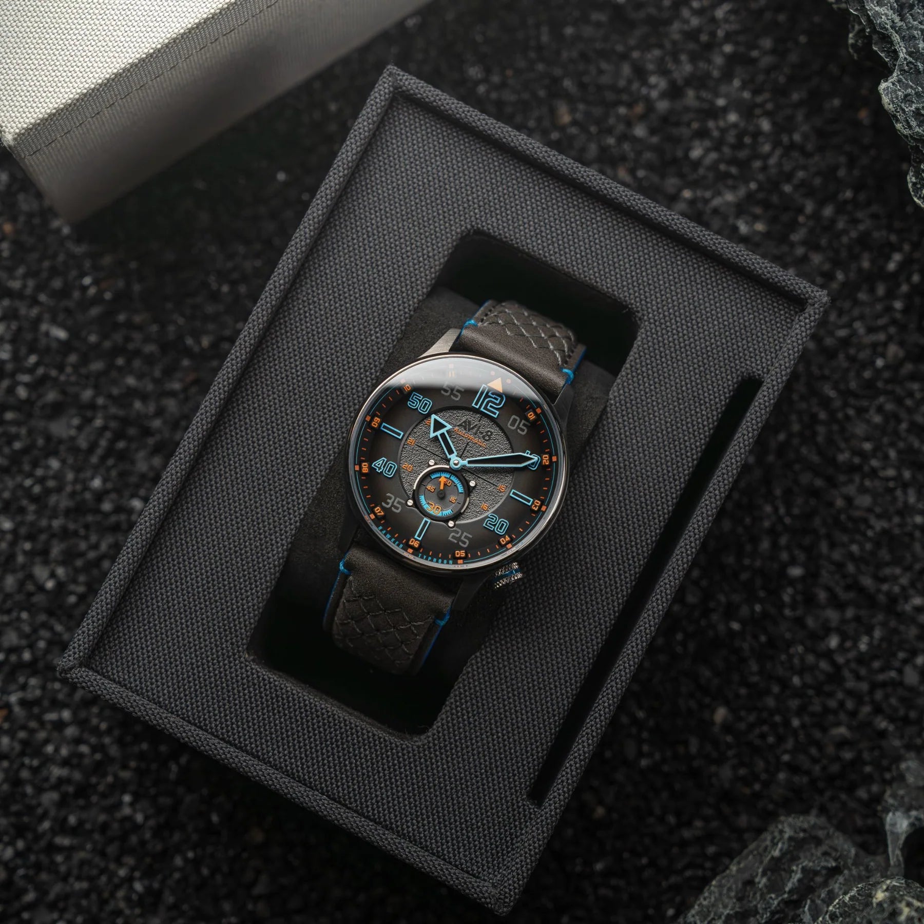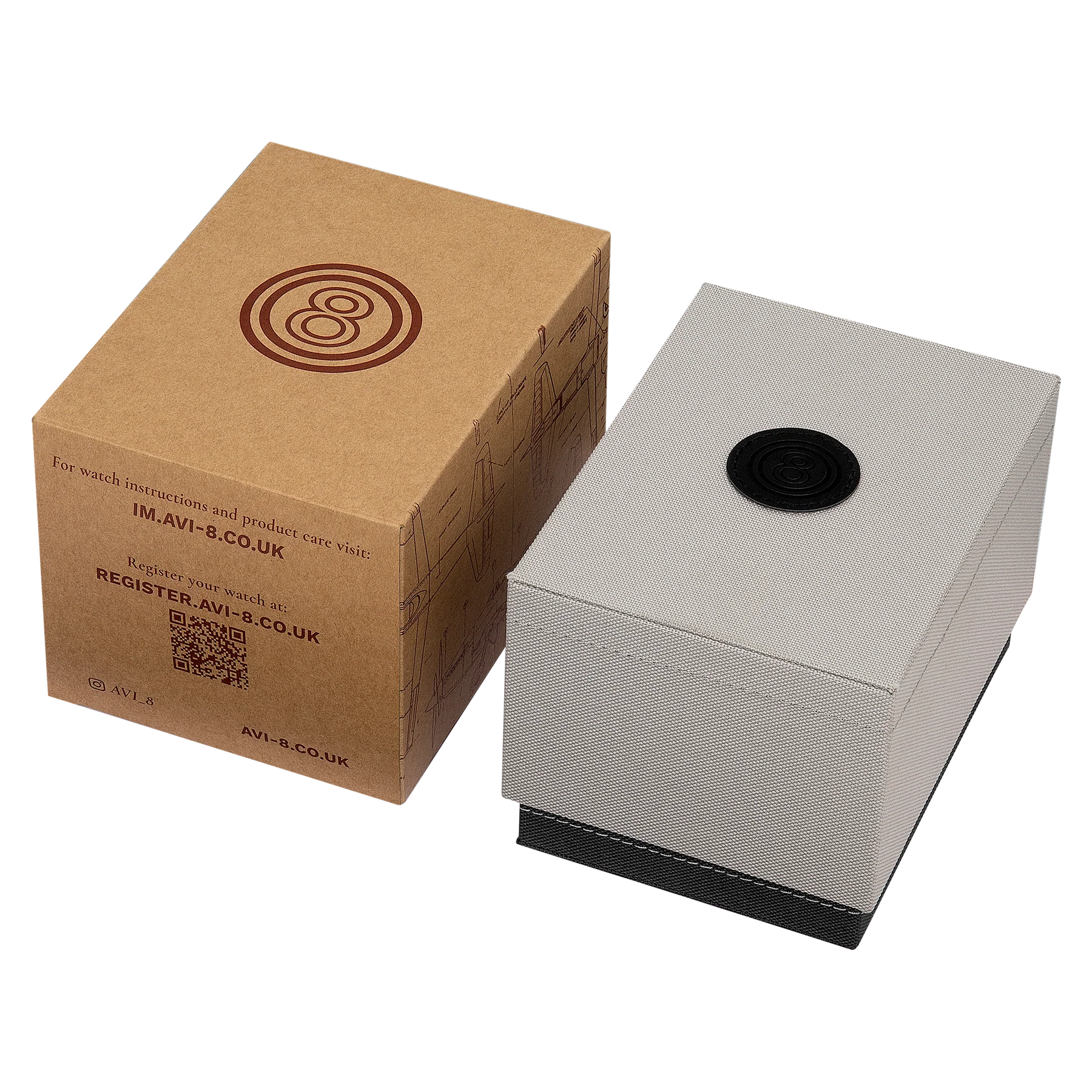 Feito para entusiastas, este relógio apresenta ponteiros suíços luminosos e índices aplicados para clareza em qualquer condição. Sua parte traseira transparente da caixa exibe um rotor personalizado e detalhes inspirados no roundel do Hawker Typhoon. Alimentado por um movimento automático japonês e protegido por uma lente de safira resistente a arranhões, o relógio garante confiabilidade e durabilidade.