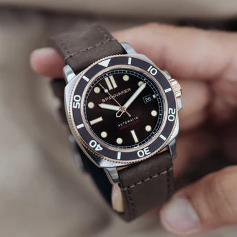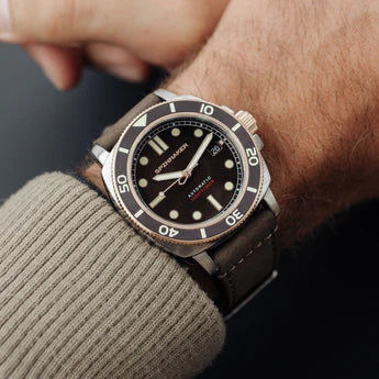 • O mergulhador Hull é um relógio robusto e elegante, projetado com uma referência à estética vintage, mas fundido a uma fabricação deliberada, dedicada e detalhada em todos os sentidos.