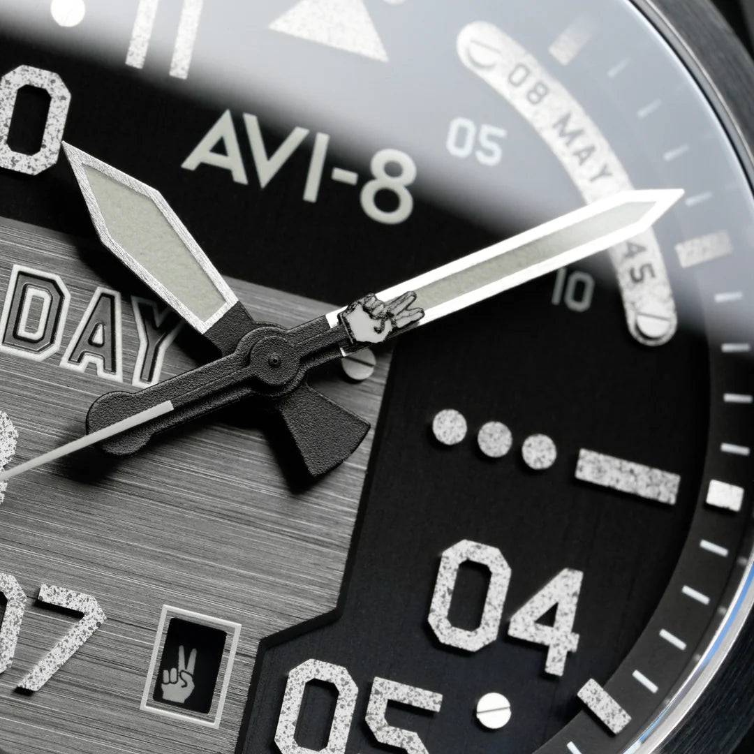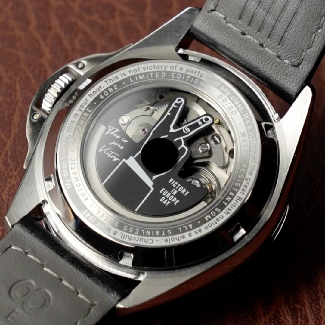 O mostrador conta uma história de triunfo. O disco da data substitui o “8” por um “V” em negrito, em homenagem a 8 de maio de 1945 e à icônica saudação de Churchill. O código Morse para “V” (•••—) está sutilmente gravado, uma mensagem de vitória que outrora ecoou pelos rádios e telegramas.