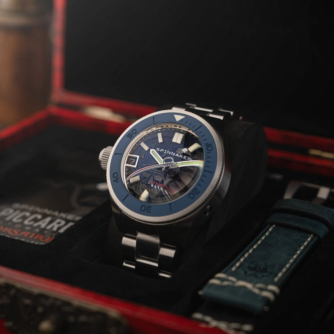 • Homenageando os corsários aventureiros, o Corsaire Limited Edition é uma fusão única de design vintage e elementos inspirados em piratas. O mostrador exibe um gráfico pirata luminoso, com uma espada pirata como ponteiro de segundos. A parte de trás do relógio apresenta uma impressionante caveira pirata 3D, feita usando tecnologia de prensagem hidráulica. Este é um testamento à relojoaria moderna, ao mesmo tempo em que presta homenagem aos Corsários.