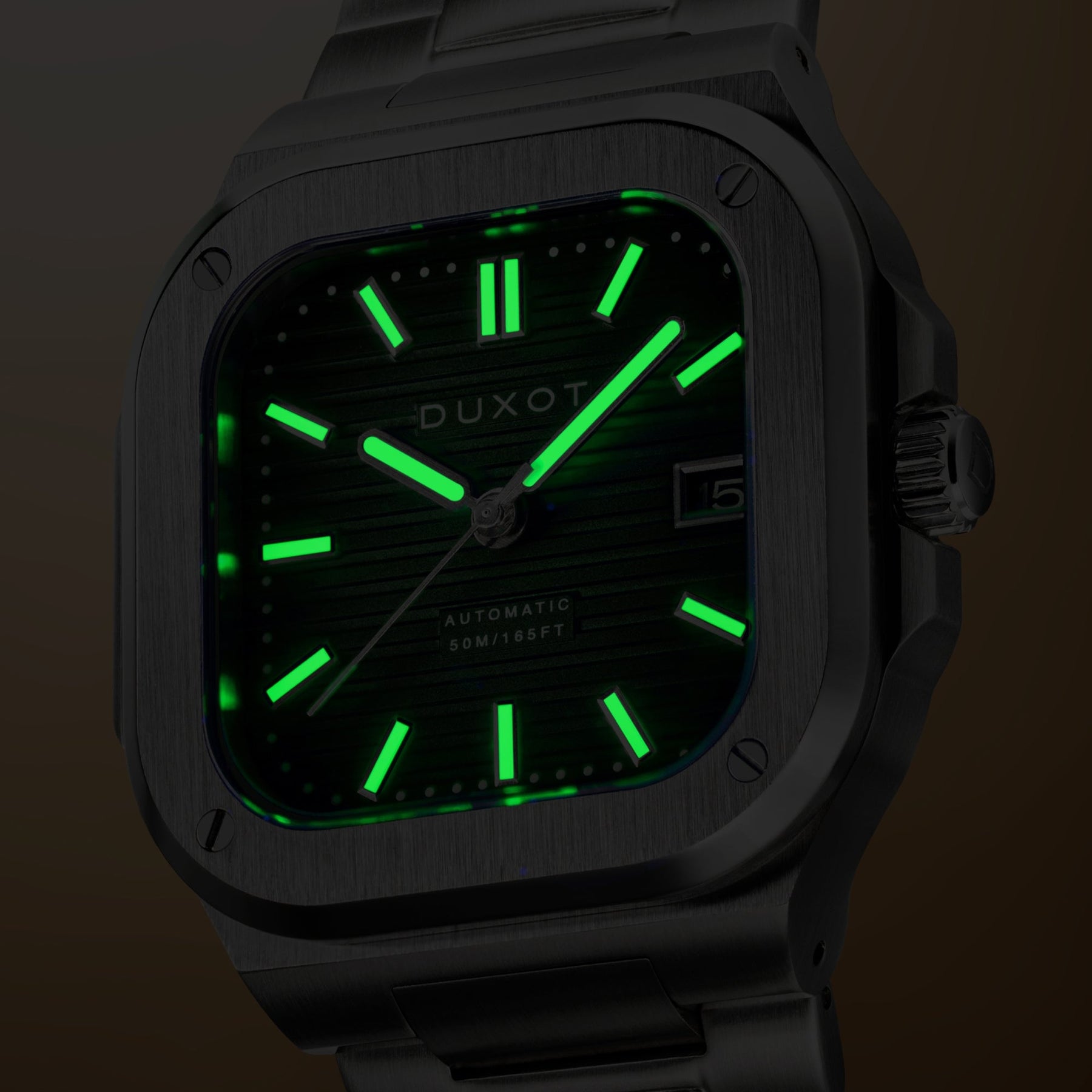 Fuja do convencional com uma caixa quadrada de 42 mm, feita em aço inoxidável com uma luneta fixa minimalista e lente de safira. A silhueta angular oferece um visual moderno e atemporal, tão marcante quanto sofisticado.