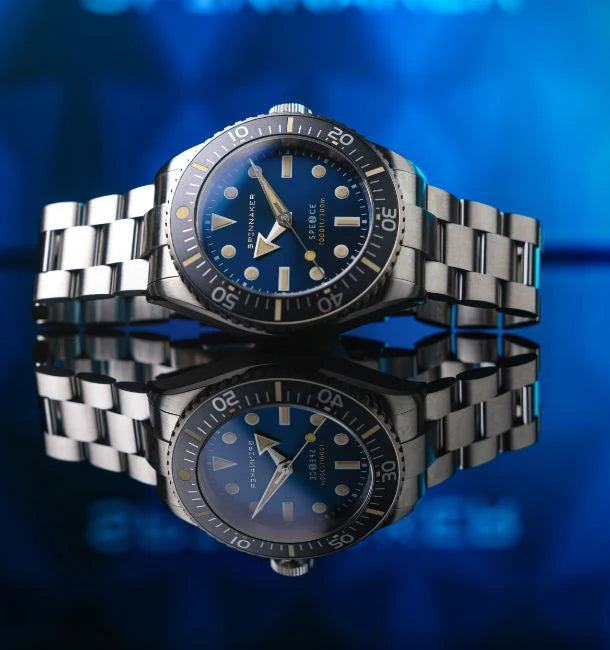 • O Spence 300 é um relógio notável. Não em peso, não em tamanho, mas na precisão absoluta de sua engenharia. O design cuidadosamente considerado e o acabamento montado à mão resultam em um relógio com apenas 10,9 mm de espessura, mas capaz de resistir a mais de 300 m de resistência à água.