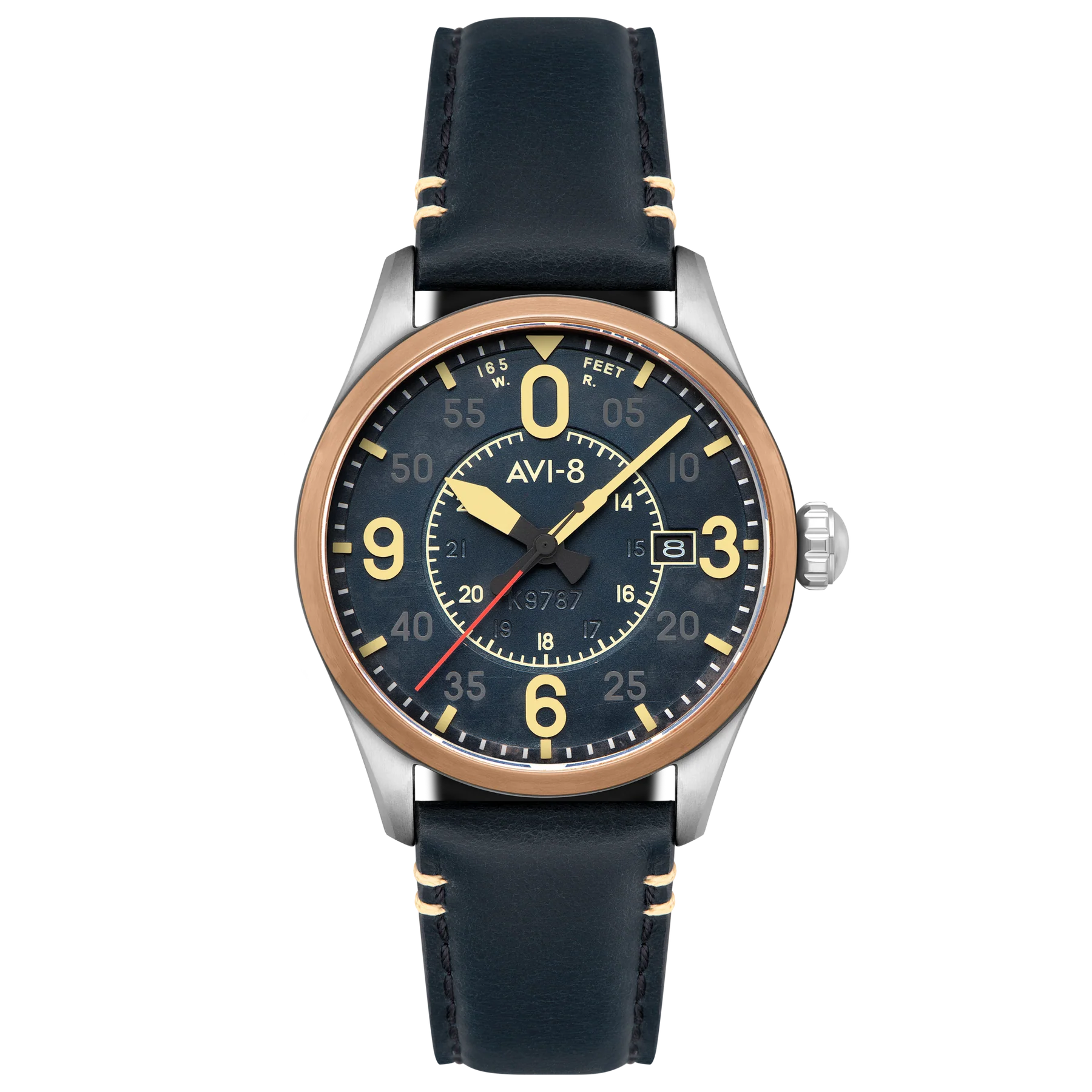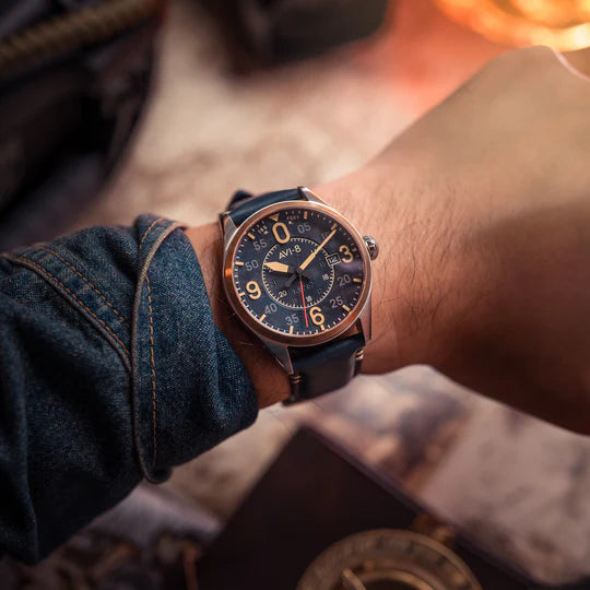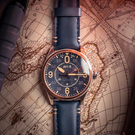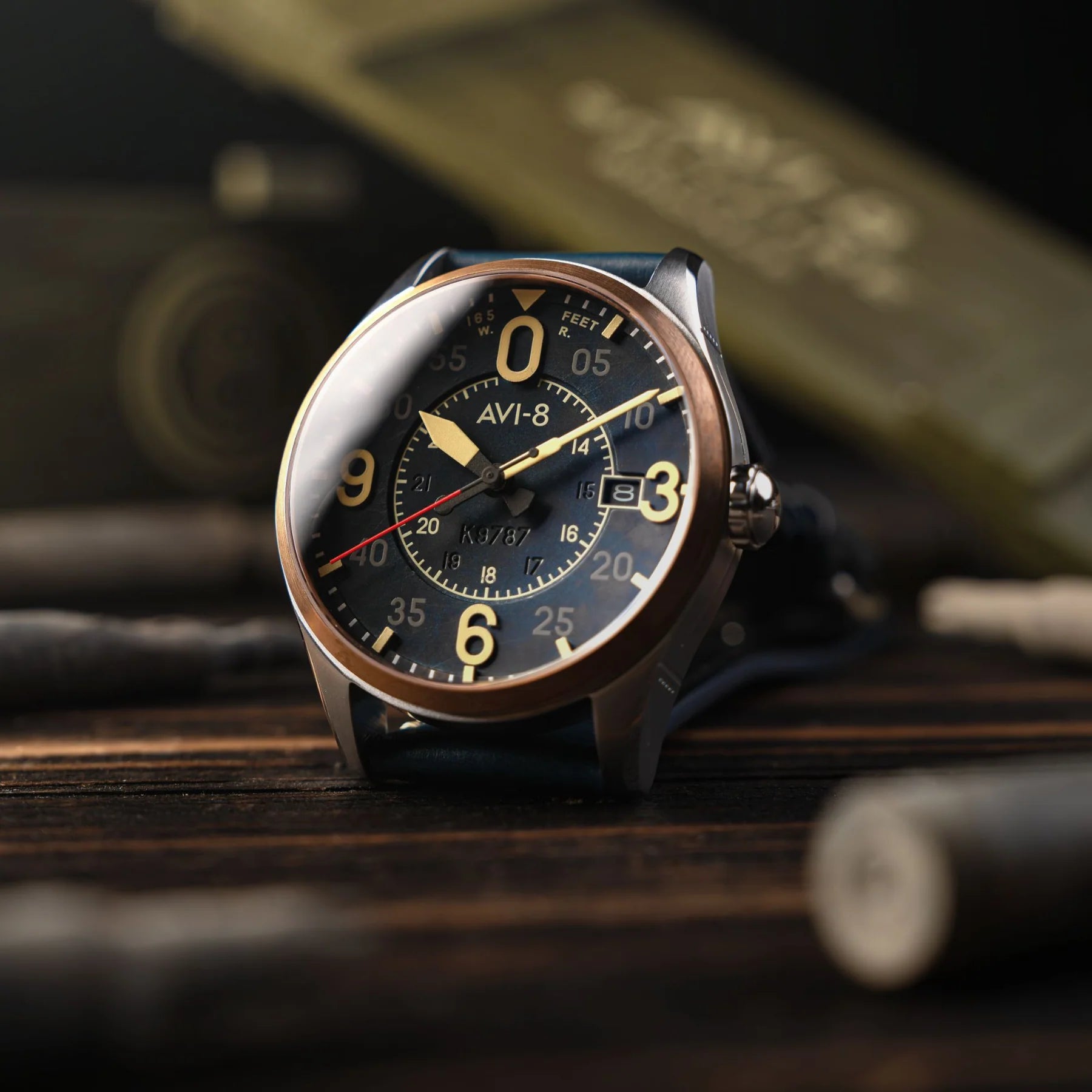 Cada relógio desta coleção incorpora o espírito do lendário Spitfire, apresentando um acabamento de mostrador desgastado único, inspirado na textura robusta das superfícies externas das aeronaves. Com um formato de caixa que remete à icônica aeronave e uma pulseira de couro genuíno, esses relógios capturam a essência da excelência na aviação.