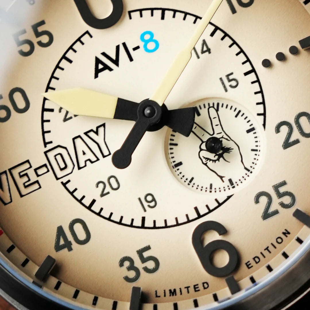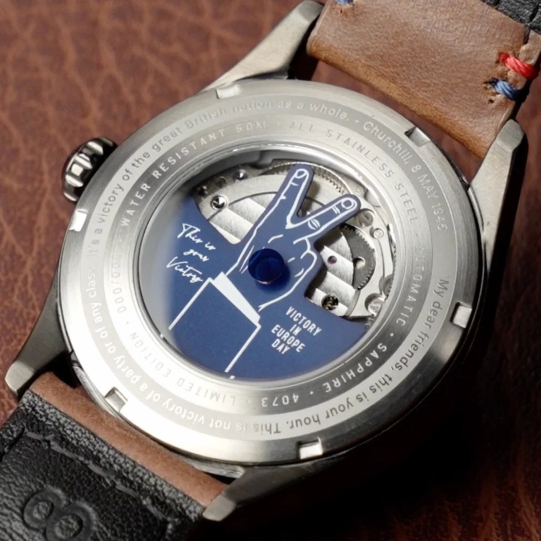 O mostrador conta uma história de triunfo. O disco da data substitui o “8” por um “V” em negrito, em homenagem a 8 de maio de 1945 e à icônica saudação de Churchill. O código Morse para “V” (•••—) está sutilmente gravado, uma mensagem de vitória que outrora ecoou pelos rádios e telegramas.