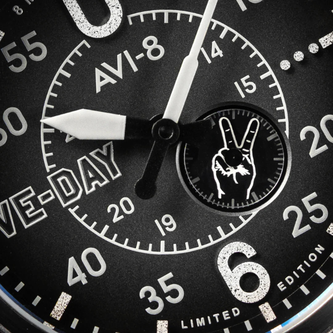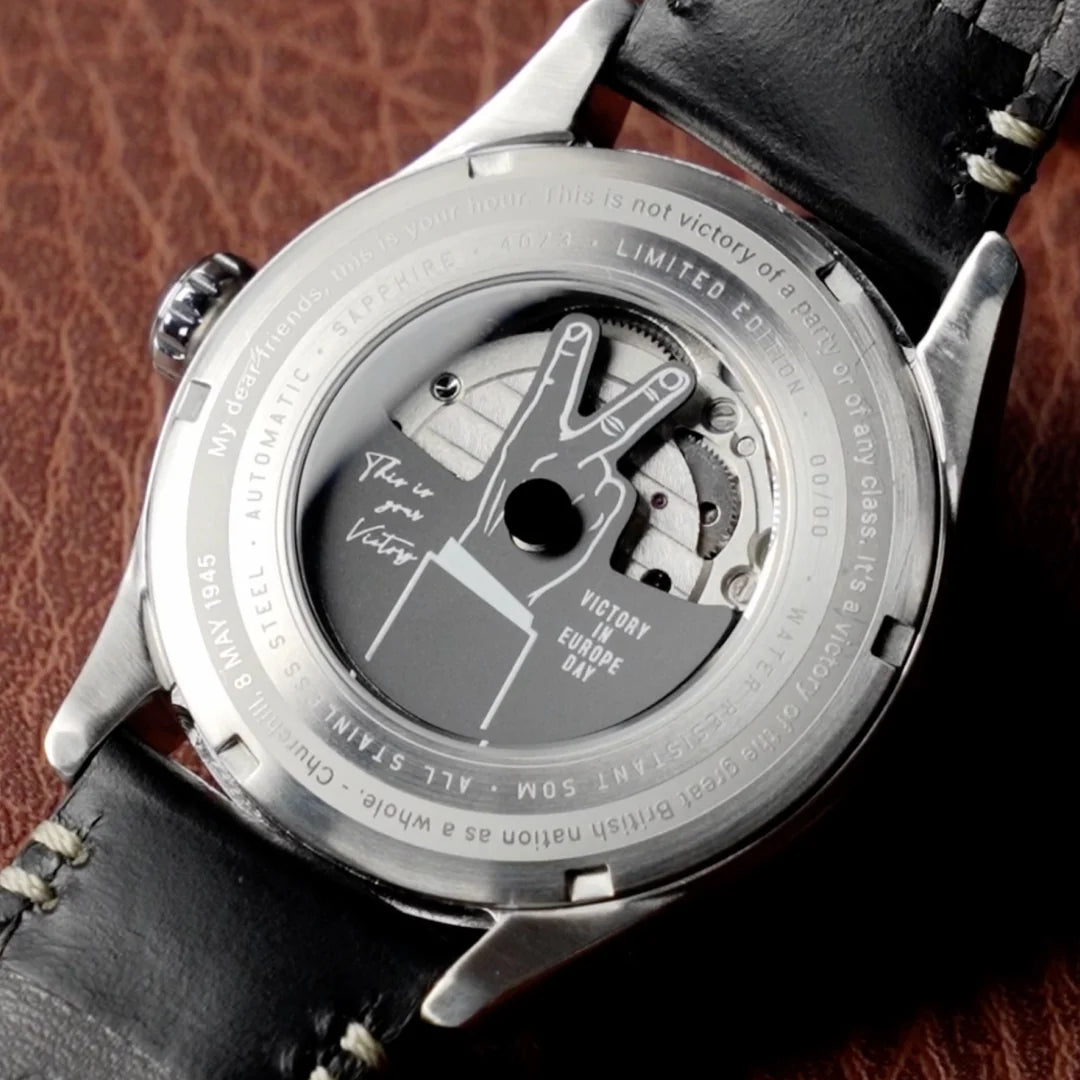 O mostrador conta uma história de triunfo. O disco da data substitui o “8” por um “V” em negrito, em homenagem a 8 de maio de 1945 e à icônica saudação de Churchill. O código Morse para “V” (•••—) está sutilmente gravado, uma mensagem de vitória que outrora ecoou pelos rádios e telegramas.