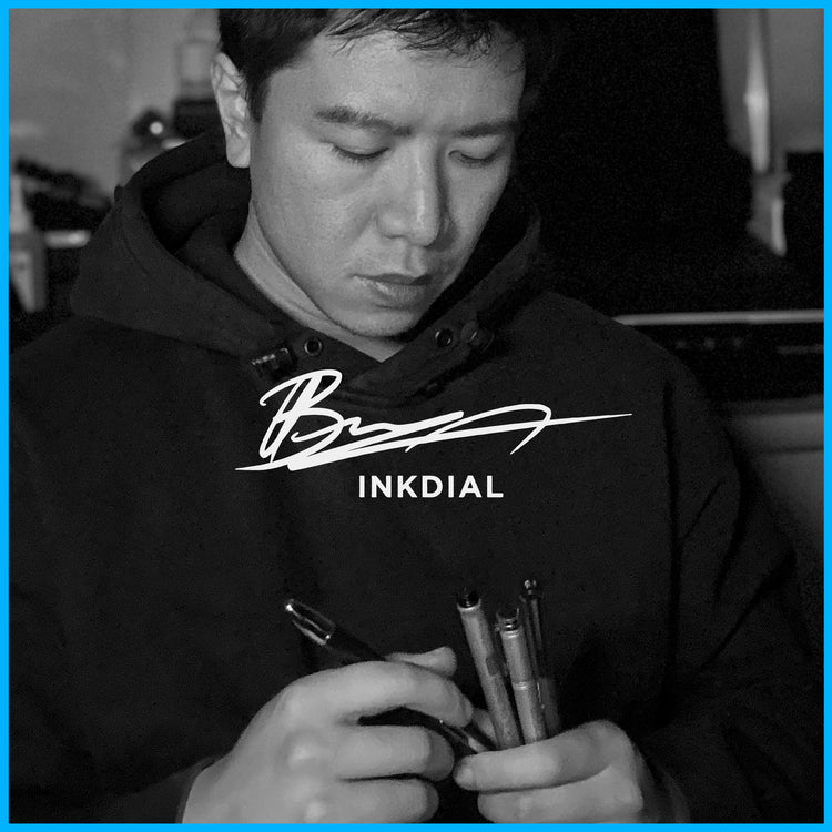 AVI-8 foi a primeira marca que Ben esboçou, tornando esta colaboração particularmente significativa. Após o sucesso da arte de edição limitada do ano passado para a embalagem do Hawker Hurricane Classic Chronos, AVI-8 e Ben decidiram aprofundar sua parceria este ano criando um relógio que captura a estética única da Inkdial. Este novo lançamento celebra o aniversário de quatro anos da Inkdial com um toque especial: o número "4" no mostrador brilha em um lume verde distinto, simbolizando a jornada e a arte de Ben.