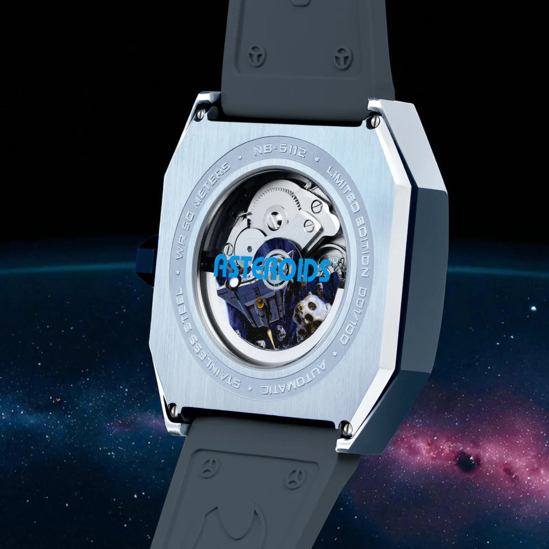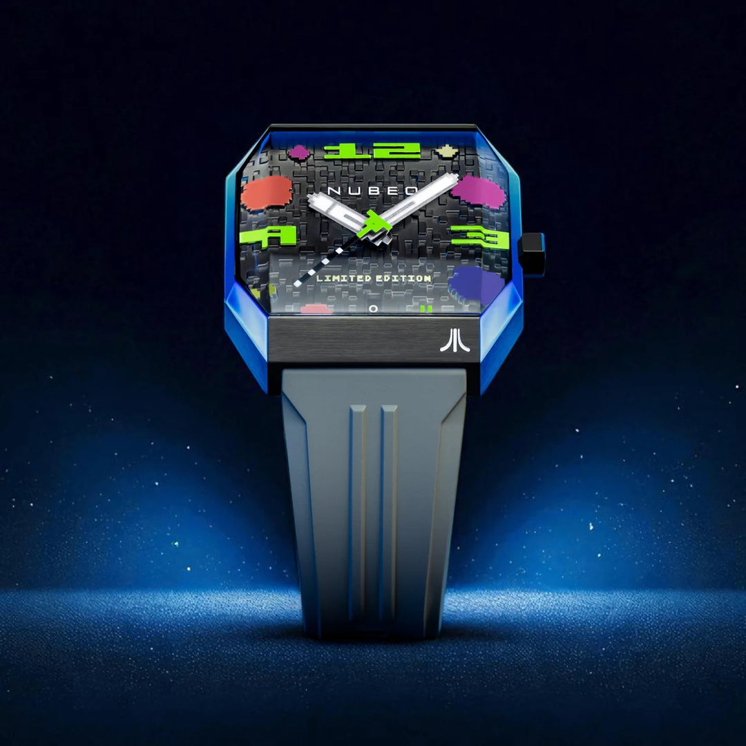 Inspirado no design original do console ATARI 2600, este relógio de caixa quadrada captura a essência dos jogos clássicos. Com um movimento automático japonês de três ponteiros e um ponteiro dos segundos em forma de nave espacial, é uma verdadeira máquina do tempo no seu pulso.