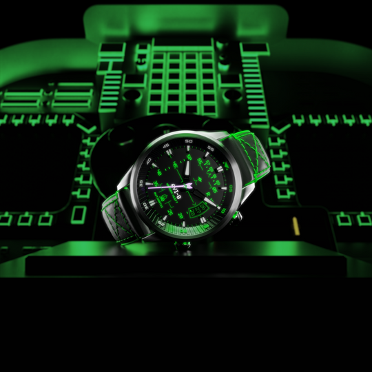 Experimente nosso exclusivo design de mostrador degradê, transitando sem esforço de tons vibrantes para sombras profundas. A construção multicamadas imita a instrumentação da aeronave, enquanto a impressão luminosa garante clareza.