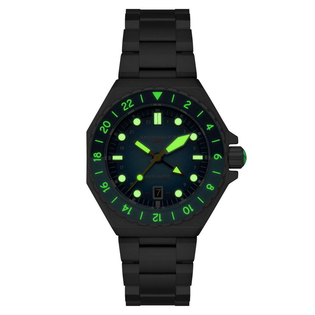 • O Dumas GMT é um relógio automático pronto para viagens ao redor do mundo equipado com o movimento automático Seiko NH34 GMT. Um estudo ousado em mecânica de relógio esportivo de alta qualidade injetado com o estilo e o estilo sinônimos do nome Spinnaker. Com uma pulseira de aço inoxidável sólido em formato hexadecimal anexada e uma pulseira de borracha extra correspondente, o relógio é adequadamente projetado para todas as condições.