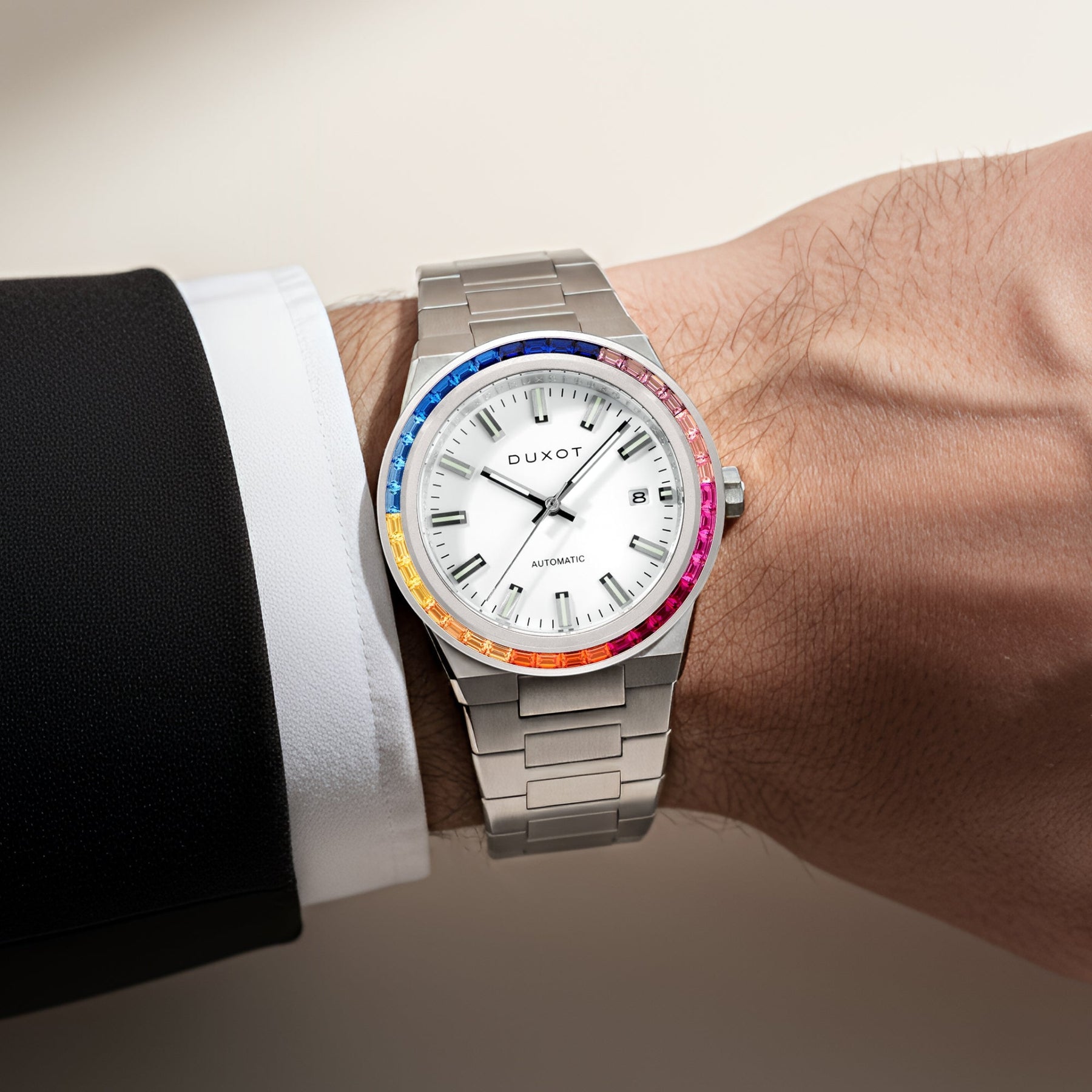 O Alicante combina a precisão mecânica com um sistema de luneta versátil — apresentando uma luneta radiante com 39 pedras em arco-íris, além de duas alternativas refinadas em tons de prata ou ouro. De cores expressivas a um polimento discreto, seu estilo muda em segundos.