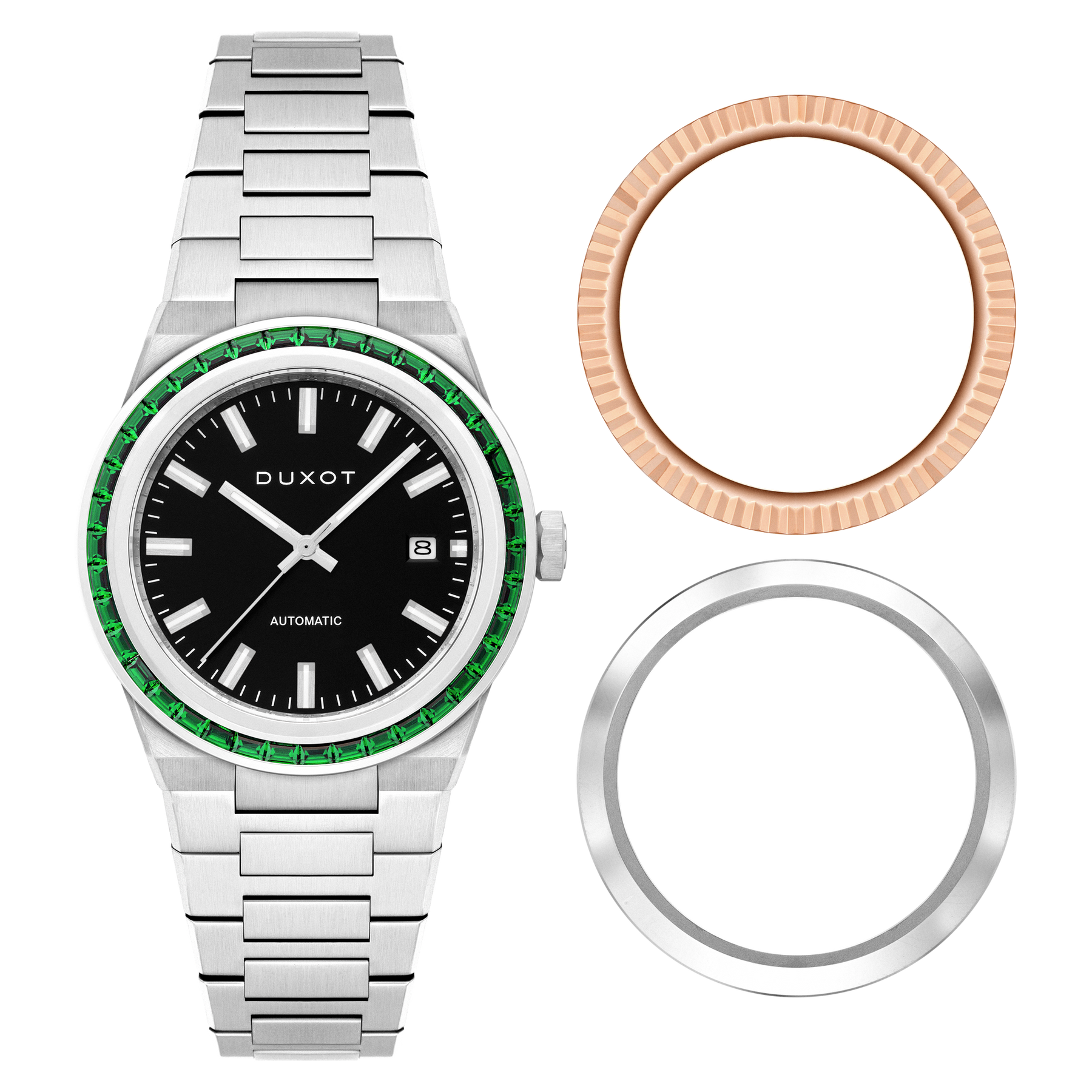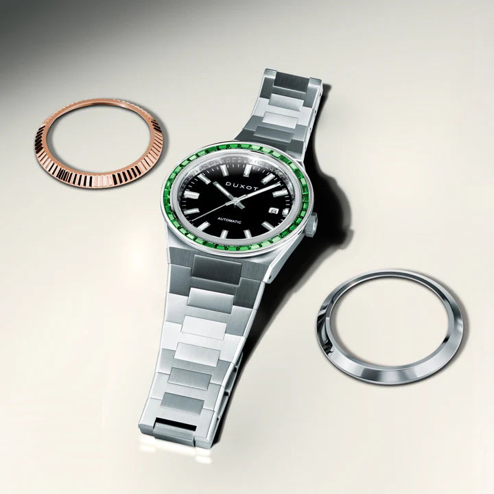O Alicante combina a precisão mecânica com um sistema de luneta versátil — apresentando uma luneta radiante com 39 pedras em arco-íris, além de duas alternativas refinadas em tons de prata ou ouro. De cores expressivas a um polimento discreto, seu estilo muda em segundos.