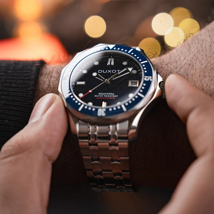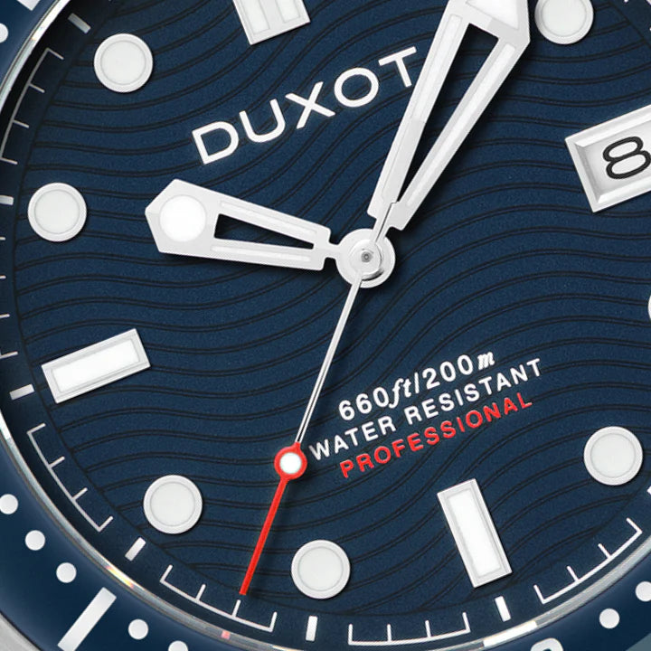 No centro do mostrador, encontra-se um padrão de ondas sutil — uma homenagem ao poder do oceano. Emoldurado por uma luneta unidirecional e com resistência à água de 20 ATM, ele foi projetado tanto para mergulhos profundos quanto para uso diário.