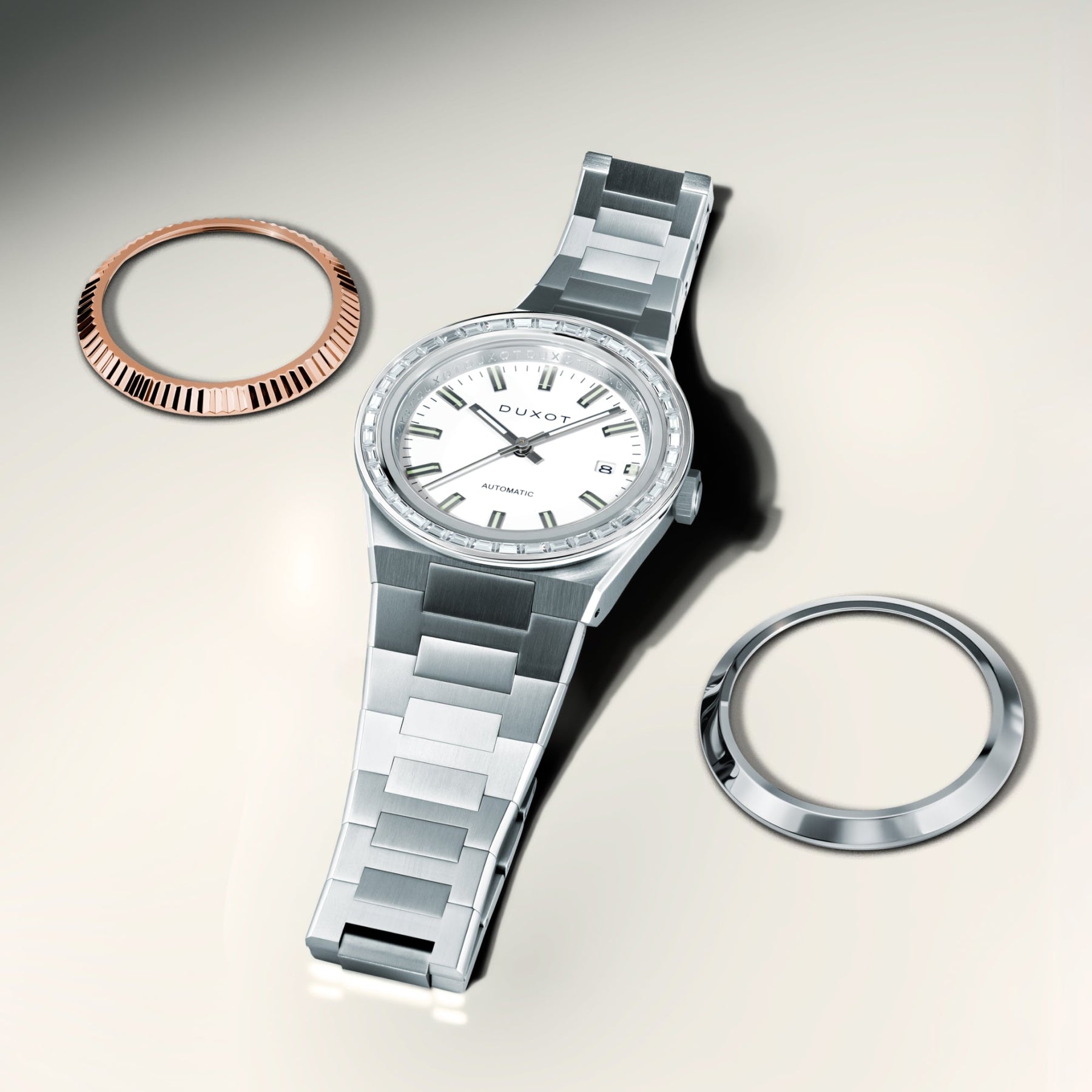 O Alicante combina a precisão mecânica com um sistema de luneta versátil — apresentando uma luneta radiante com 39 pedras em arco-íris, além de duas alternativas refinadas em tons de prata ou ouro. De cores expressivas a um polimento discreto, seu estilo muda em segundos.