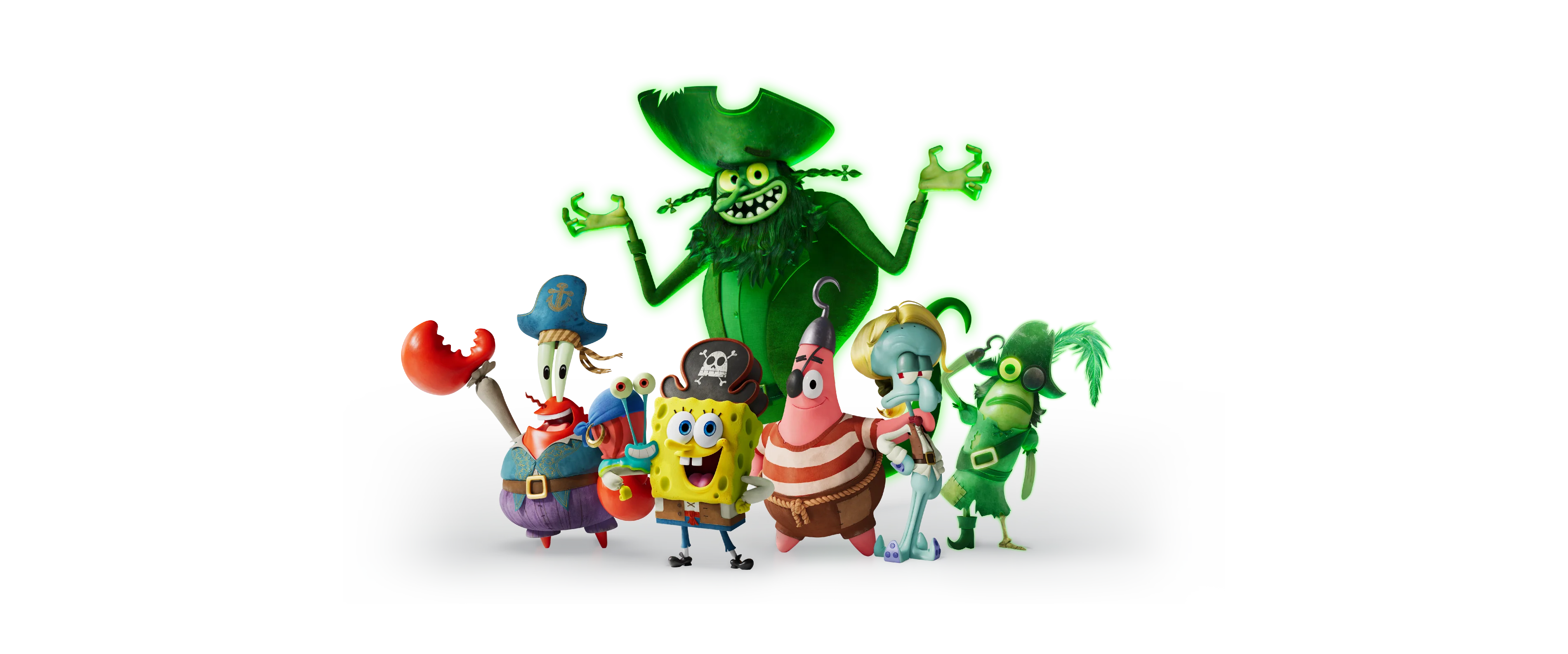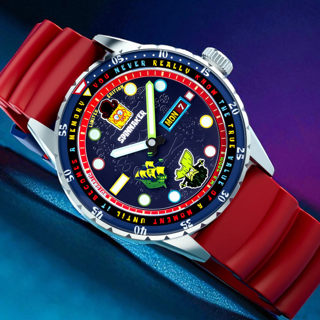 Bob Esponja Pirata revelado por luz UV. Brilho luminoso suíço. Em seu interior, pulsa o coração da precisão: o movimento automático japonês.
