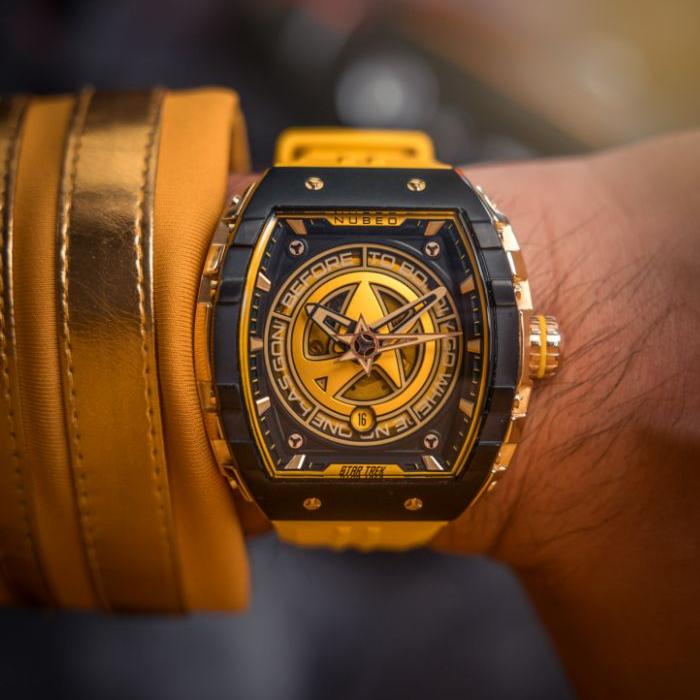 A Nubeo orgulhosamente apresenta sua terceira colaboração com a icônica franquia Star Trek. Este relógio requintado exibe uma cativante vista lateral em 3D da icônica nave estelar NCC-1701D em seu mostrador. O design intrincado captura cada detalhe da nave, em um fundo elegante e moderno que combina estética futurista com elegância atemporal.