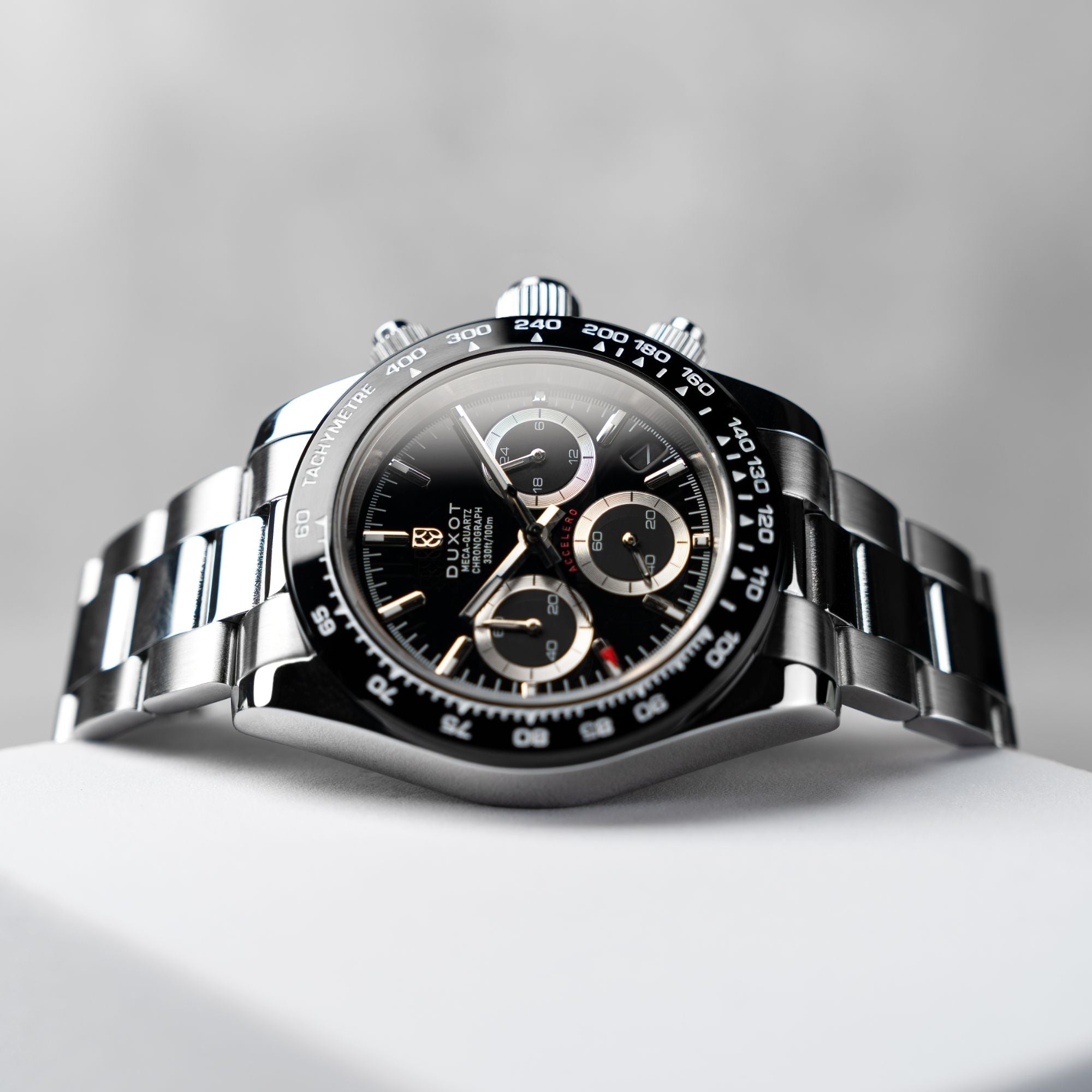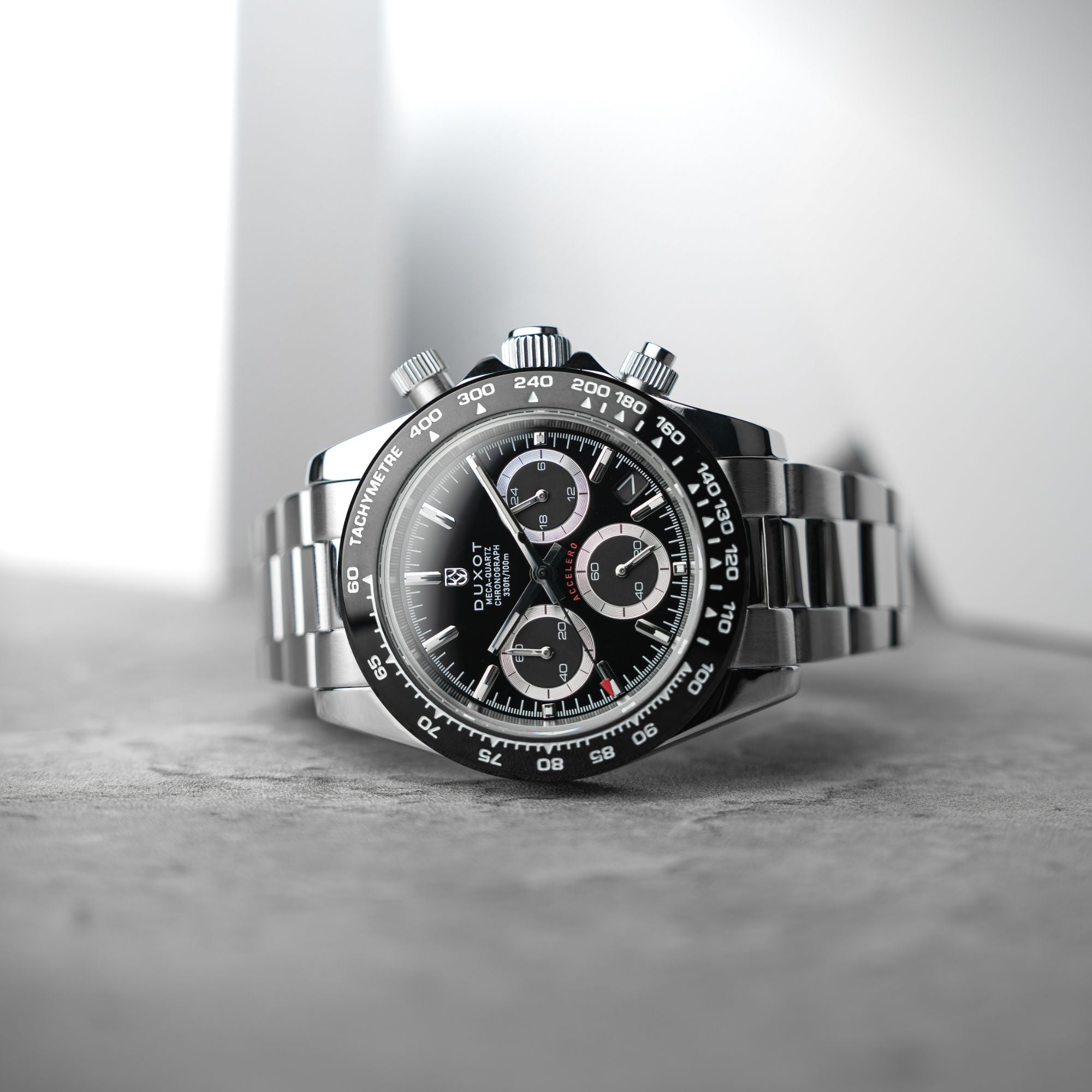 Equipado com um mecanismo de quartzo cronógrafo japonês e alojado numa robusta caixa de aço inoxidável de 40 mm, o Accelero é o acessório essencial para o seu pulso.