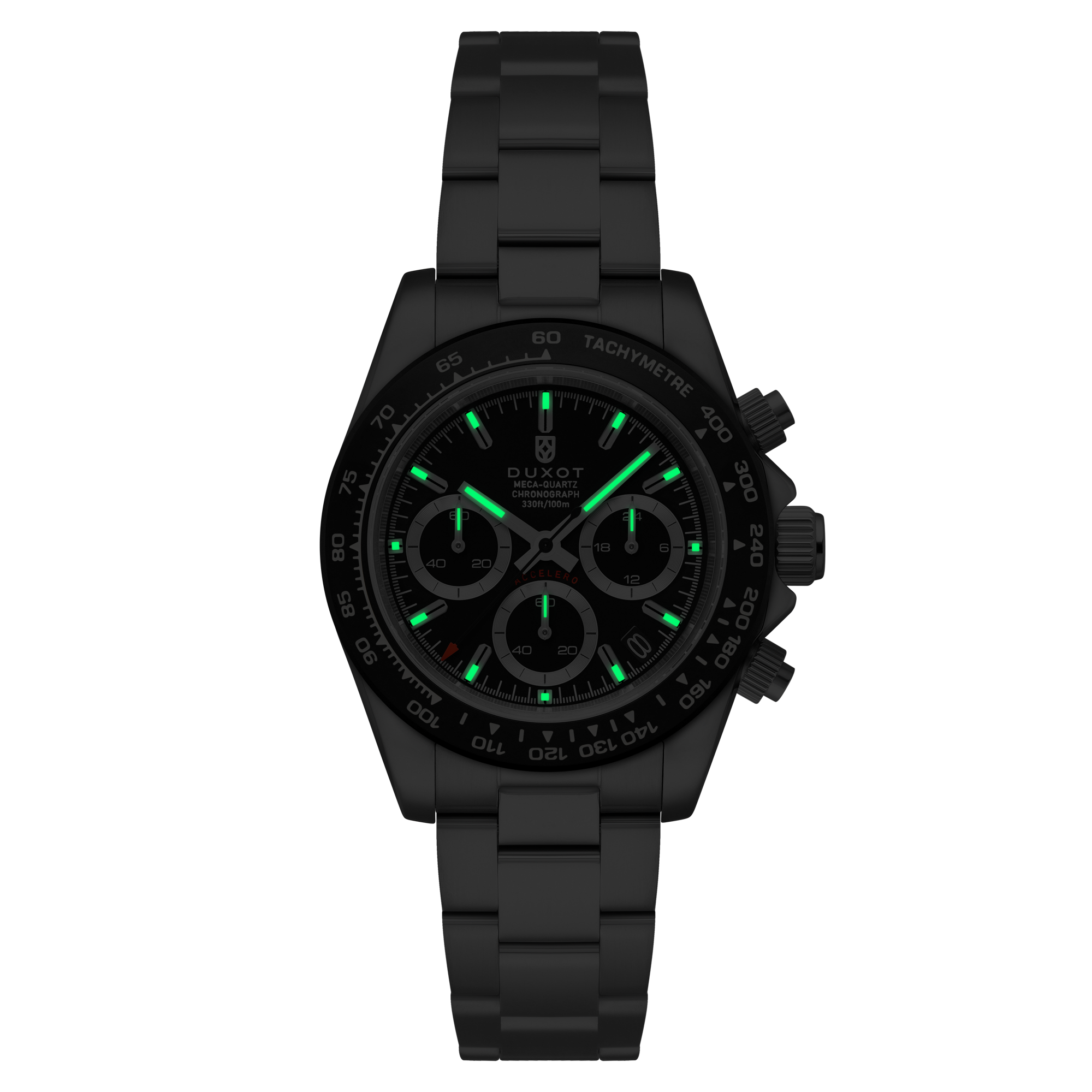 Equipado com lente de safira, coroa rosqueada e resistência à água de 10 ATM, o cronógrafo Accelero foi projetado para versatilidade, durabilidade e conforto constante, dia após dia.